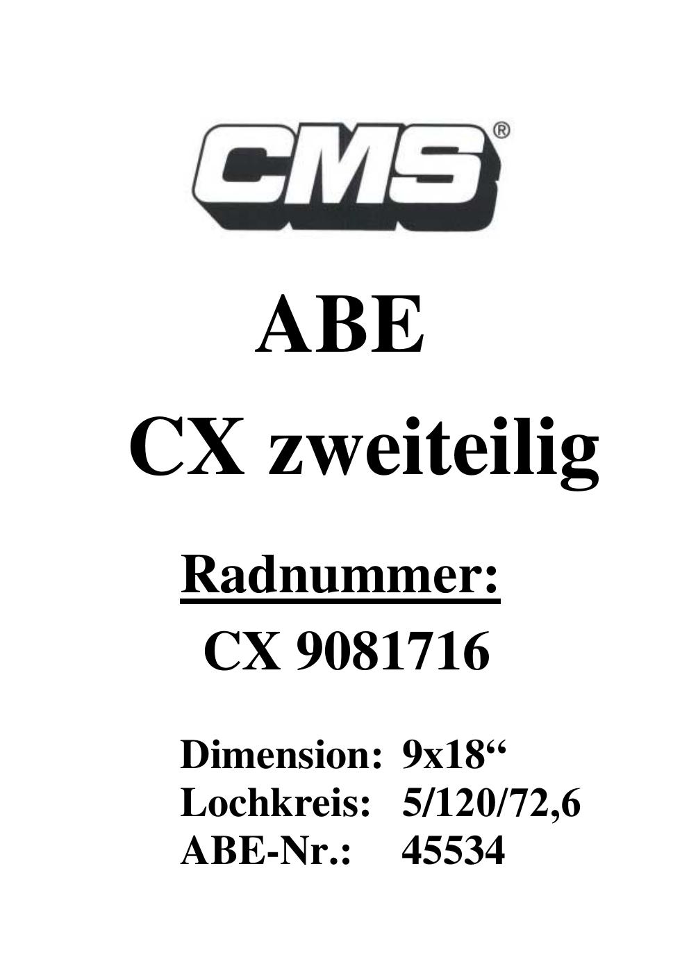 Dieses Gutachten (ABE) bezieht sich auf die Alufelge CMS UNKNOWN in der Ausführung ET 0, Mittenloch 0 mm (KBA 45534). Im PDF findest du typischerweise zulässige Reifengrößen, Auflagen/Anbauhinweise und – je nach Dokument – Hinweise zur Eintragung.