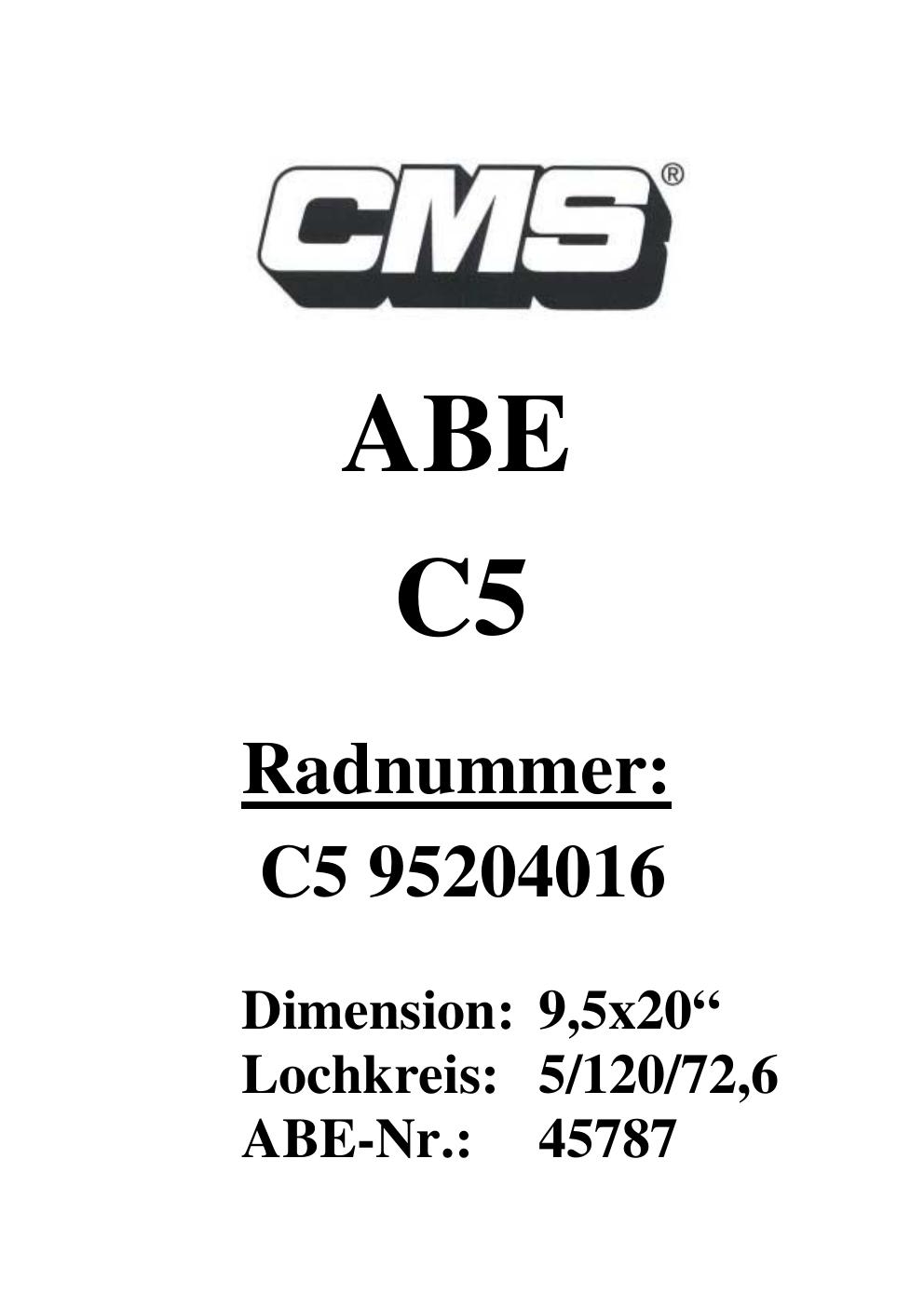 Dieses Gutachten (ABE) bezieht sich auf die Alufelge CMS UNKNOWN in der Ausführung ET 0, Mittenloch 0 mm (KBA 45787). Im PDF findest du typischerweise zulässige Reifengrößen, Auflagen/Anbauhinweise und – je nach Dokument – Hinweise zur Eintragung.