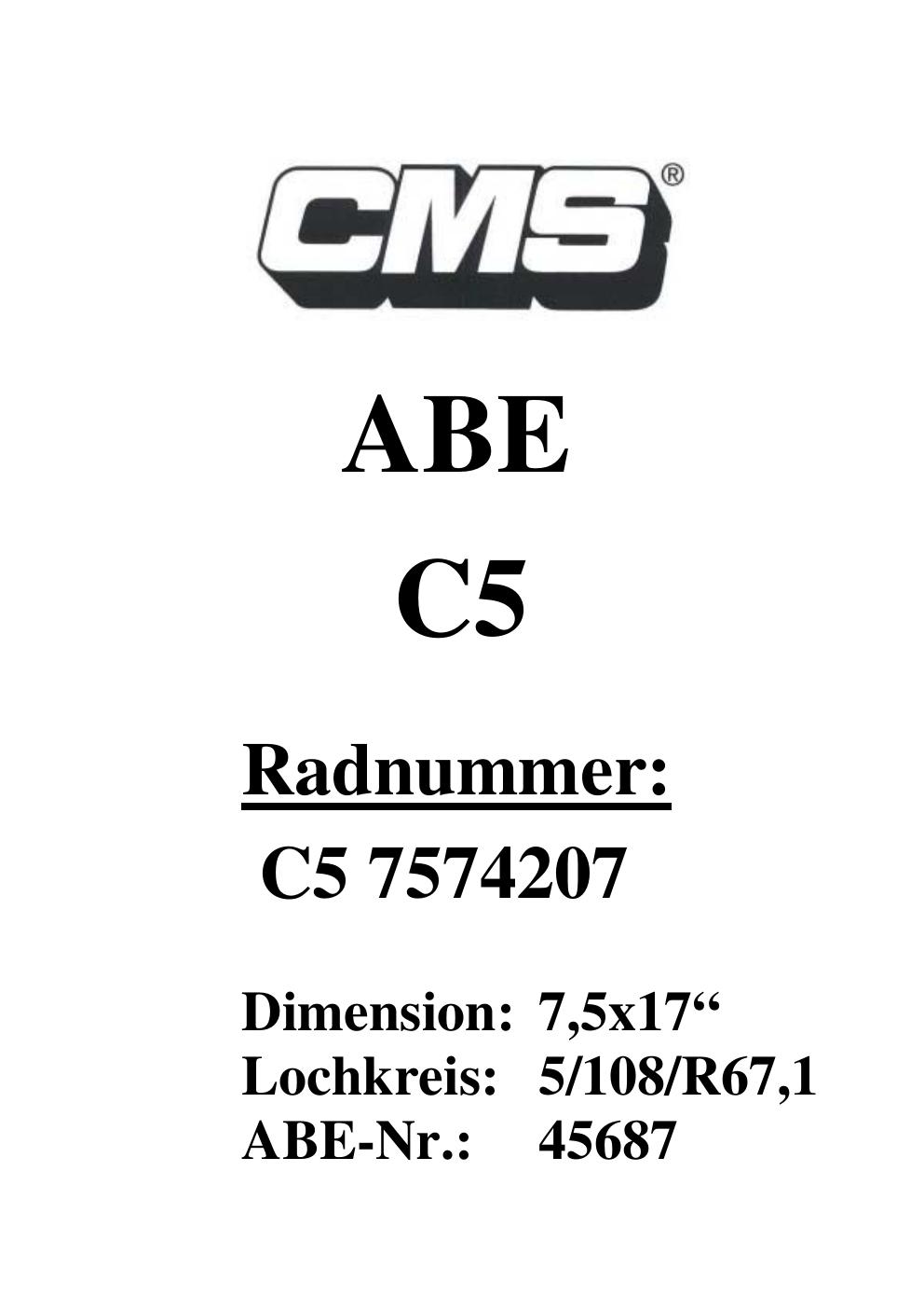 Dieses Gutachten (ABE) bezieht sich auf die Alufelge CMS UNKNOWN in der Ausführung ET 0, Mittenloch 0 mm (KBA 45687). Im PDF findest du typischerweise zulässige Reifengrößen, Auflagen/Anbauhinweise und – je nach Dokument – Hinweise zur Eintragung.