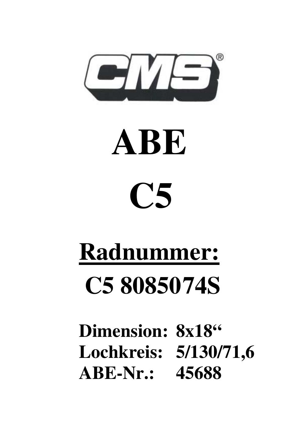 Dieses Gutachten (ABE) bezieht sich auf die Alufelge CMS UNKNOWN in der Ausführung ET 0, Mittenloch 0 mm (KBA 45688). Im PDF findest du typischerweise zulässige Reifengrößen, Auflagen/Anbauhinweise und – je nach Dokument – Hinweise zur Eintragung.