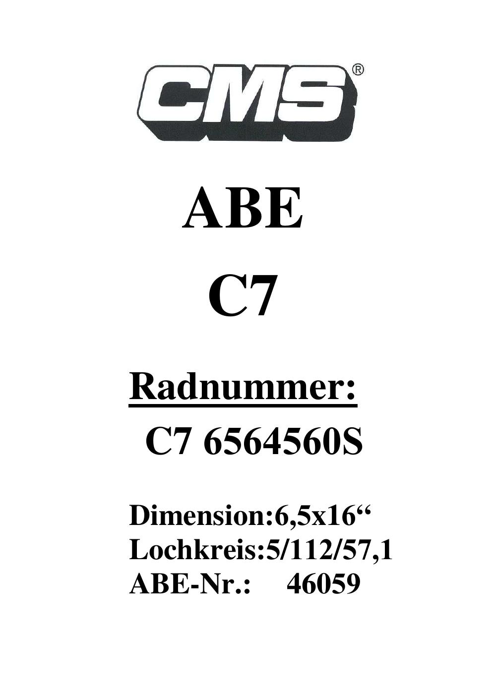 Dieses Gutachten (ABE) bezieht sich auf die Alufelge CMS UNKNOWN in der Ausführung ET 0, Mittenloch 0 mm (KBA 46059). Im PDF findest du typischerweise zulässige Reifengrößen, Auflagen/Anbauhinweise und – je nach Dokument – Hinweise zur Eintragung.