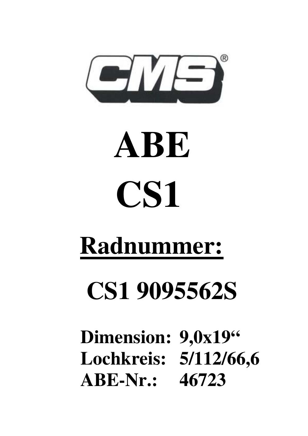 Dieses Gutachten (ABE) bezieht sich auf die Alufelge CMS UNKNOWN in der Ausführung ET 0, Mittenloch 0 mm (KBA 46723). Im PDF findest du typischerweise zulässige Reifengrößen, Auflagen/Anbauhinweise und – je nach Dokument – Hinweise zur Eintragung.