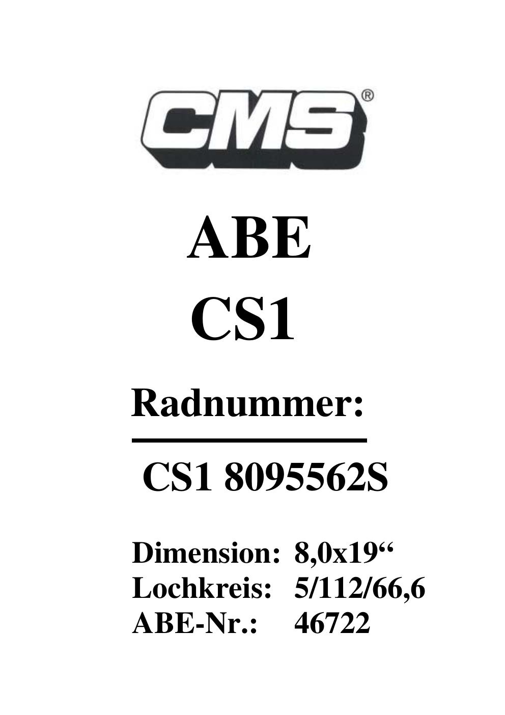 Dieses Gutachten (ABE) bezieht sich auf die Alufelge CMS UNKNOWN in der Ausführung ET 0, Mittenloch 0 mm (KBA 46722). Im PDF findest du typischerweise zulässige Reifengrößen, Auflagen/Anbauhinweise und – je nach Dokument – Hinweise zur Eintragung.