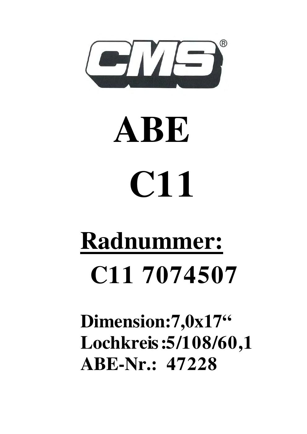 Dieses Gutachten (ABE) bezieht sich auf die Alufelge CMS UNKNOWN in der Ausführung ET 0, Mittenloch 0 mm (KBA 47228). Im PDF findest du typischerweise zulässige Reifengrößen, Auflagen/Anbauhinweise und – je nach Dokument – Hinweise zur Eintragung.