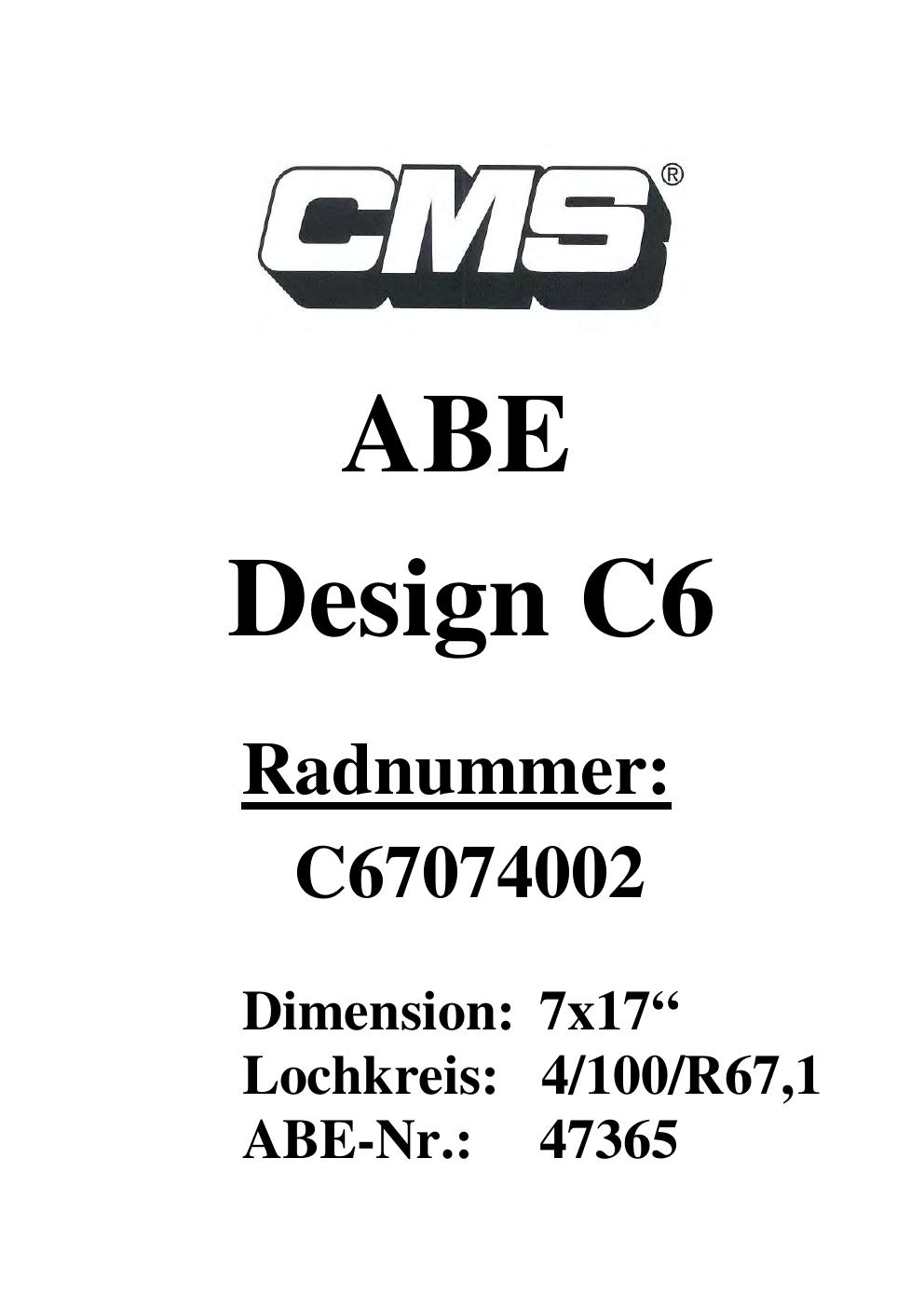 Dieses Gutachten (ABE) bezieht sich auf die Alufelge CMS UNKNOWN in der Ausführung ET 0, Mittenloch 0 mm (KBA 47365). Im PDF findest du typischerweise zulässige Reifengrößen, Auflagen/Anbauhinweise und – je nach Dokument – Hinweise zur Eintragung.