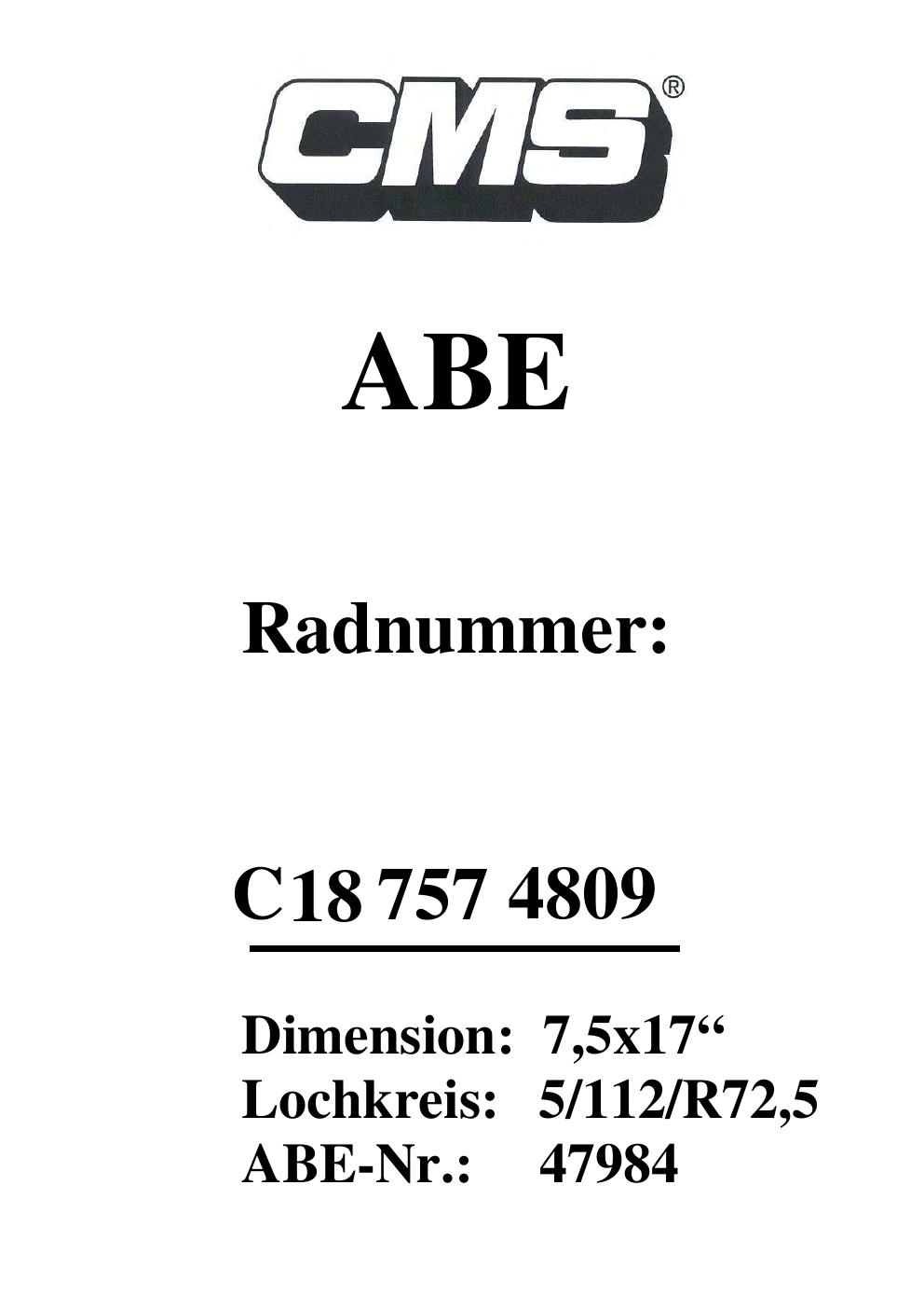 Dieses Gutachten (ABE) bezieht sich auf die Alufelge CMS UNKNOWN in der Ausführung ET 0, Mittenloch 0 mm (KBA 47984). Im PDF findest du typischerweise zulässige Reifengrößen, Auflagen/Anbauhinweise und – je nach Dokument – Hinweise zur Eintragung.