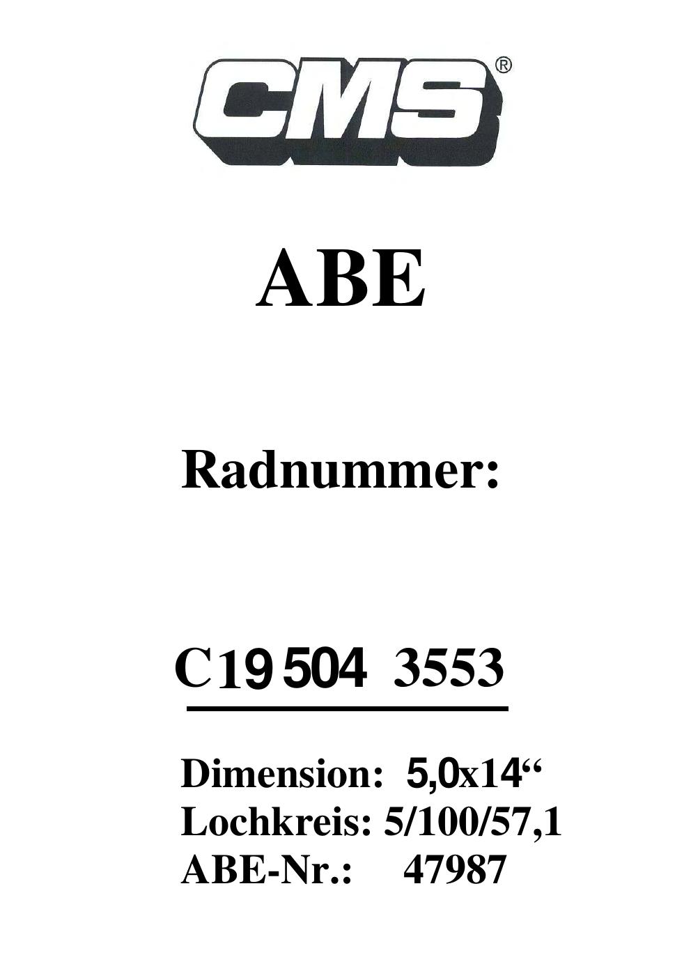 Dieses Gutachten (ABE) bezieht sich auf die Alufelge CMS UNKNOWN in der Ausführung ET 0, Mittenloch 0 mm (KBA 47987). Im PDF findest du typischerweise zulässige Reifengrößen, Auflagen/Anbauhinweise und – je nach Dokument – Hinweise zur Eintragung.