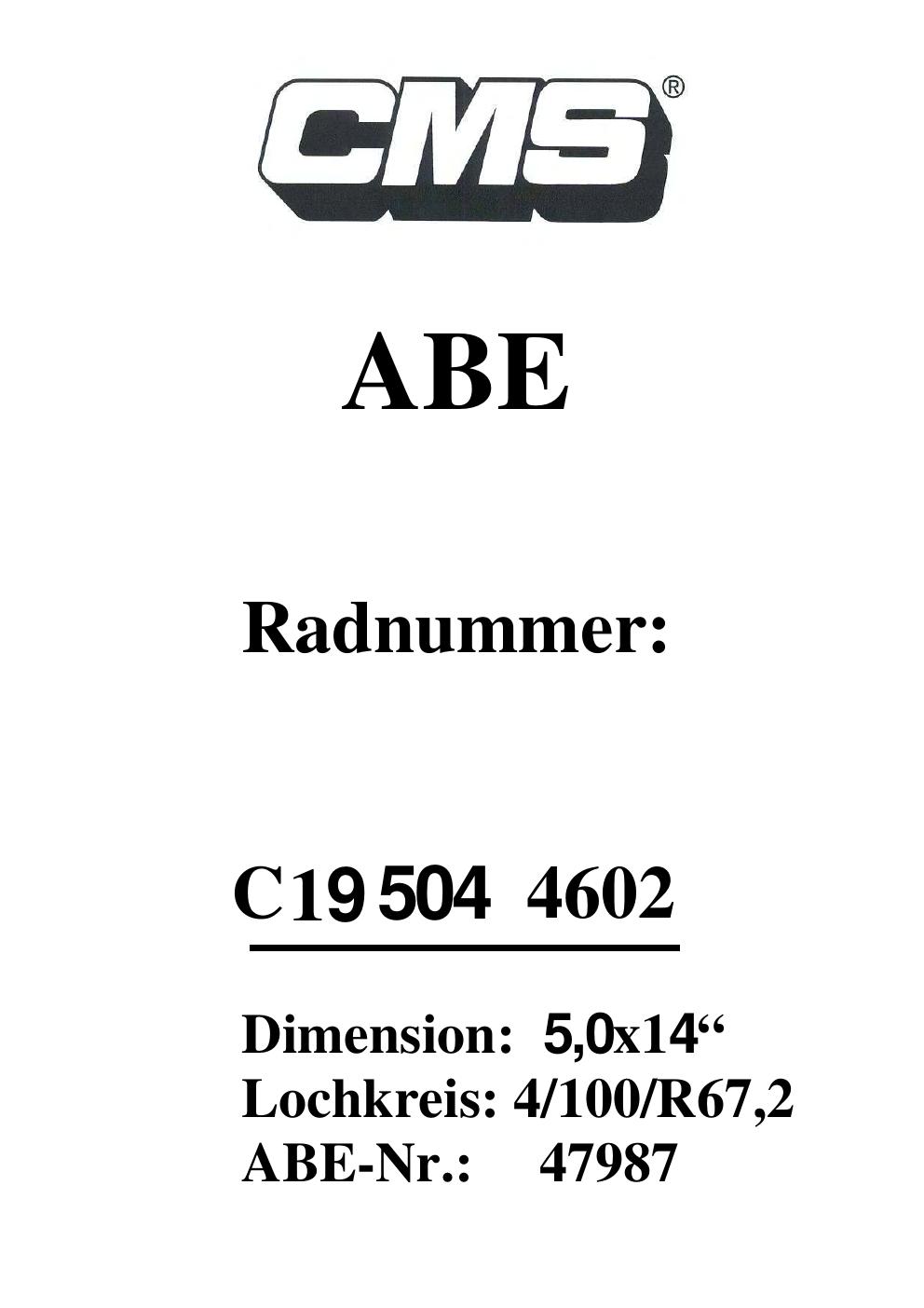 Dieses ABE gehört zur Felge CMS V1 in ET0 mit KBA 47987. Die Seite ist dafür gedacht, dass du schnell prüfen kannst, ob KBA, Design und Größe zu deiner Felge passen und danach direkt das richtige PDF lädst.