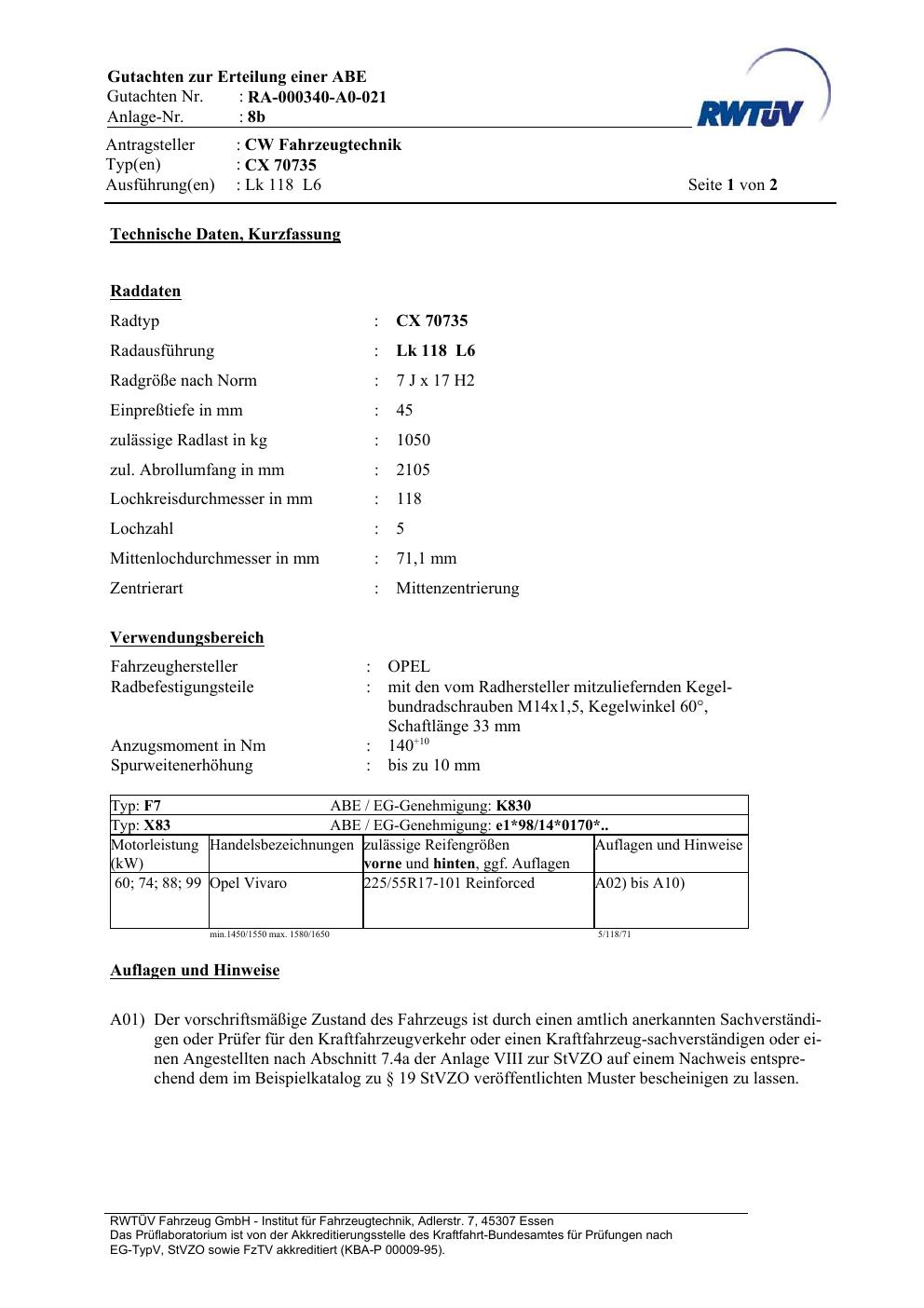 teilegutachten ra-000340-a0-021 CW Fahrzeugtechnik CX 70735