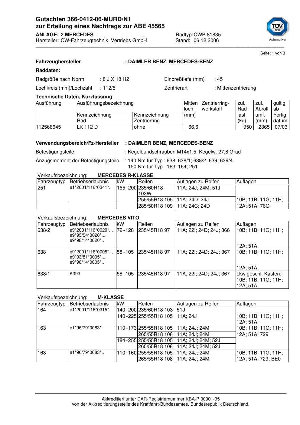 Dieses Gutachten (abe) bezieht sich auf die Alufelge CW-Fahrzeugtechnik Vertriebs GmbH CWB 81835 in der Ausführung ET 0, Mittenloch 0 mm (KBA 45565). Im PDF findest du typischerweise zulässige Reifengrößen, Auflagen/Anbauhinweise und – je nach Dokument – Hinweise zur Eintragung.