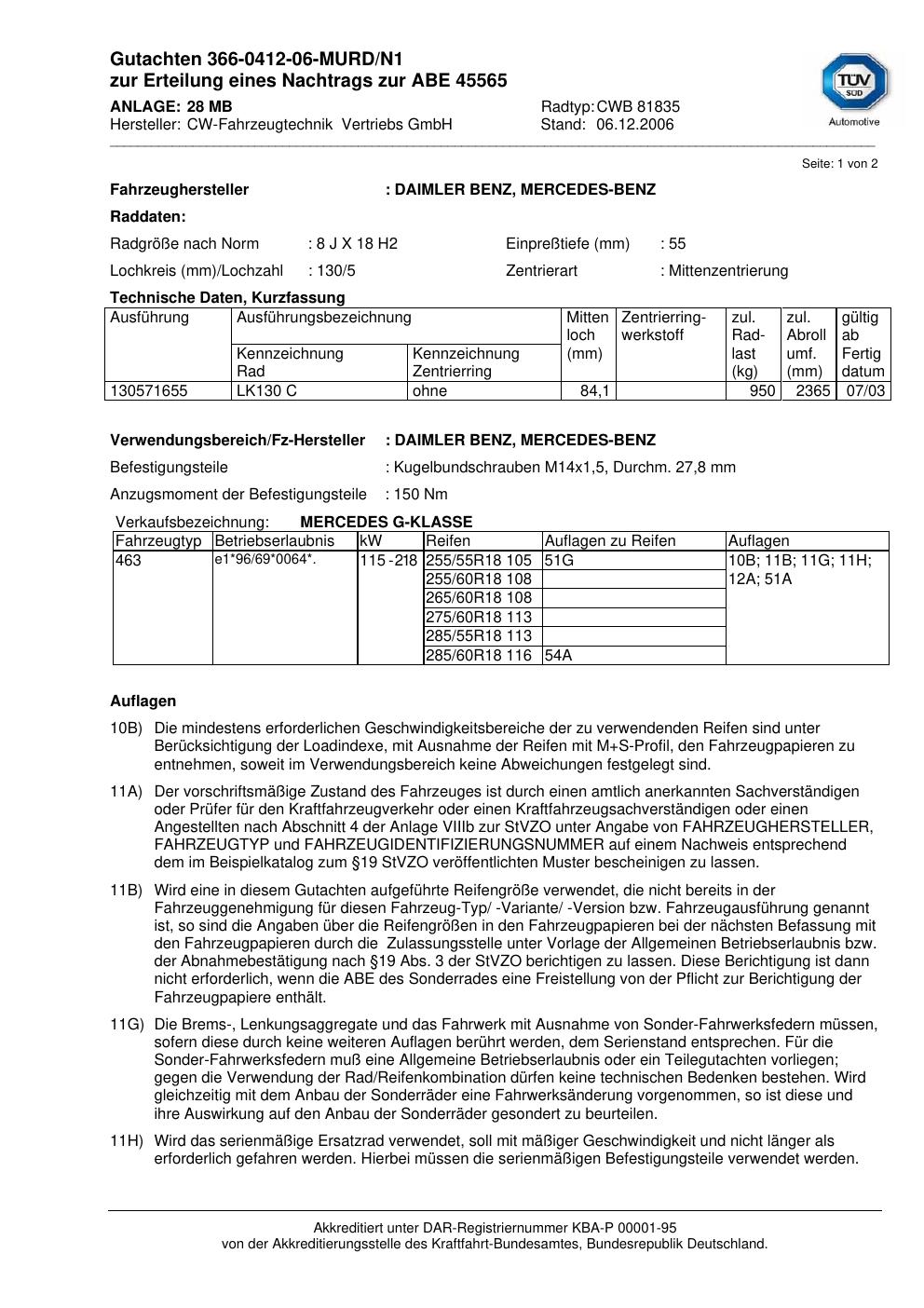 Dieses Gutachten (abe) bezieht sich auf die Alufelge CW-Fahrzeugtechnik Vertriebs GmbH CWB 81835 in der Ausführung ET 0, Mittenloch 0 mm (KBA 45565). Im PDF findest du typischerweise zulässige Reifengrößen, Auflagen/Anbauhinweise und – je nach Dokument – Hinweise zur Eintragung.