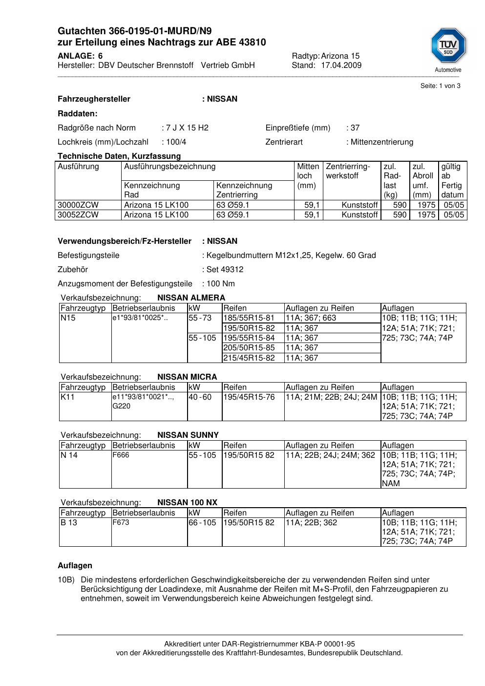Felgengutachten / abe für Alufelgen DBV Deutscher Brennstoff Vertrieb GmbH Arizona 15 (ET 0, Mittenloch 0 mm) mit KBA 43810 (Zertifikatsnummer 43810). Hier kostenlos als PDF herunterladen. Der Download-Link ist 24 Stunden gültig und kann bis zu zwei Mal verwendet werden.