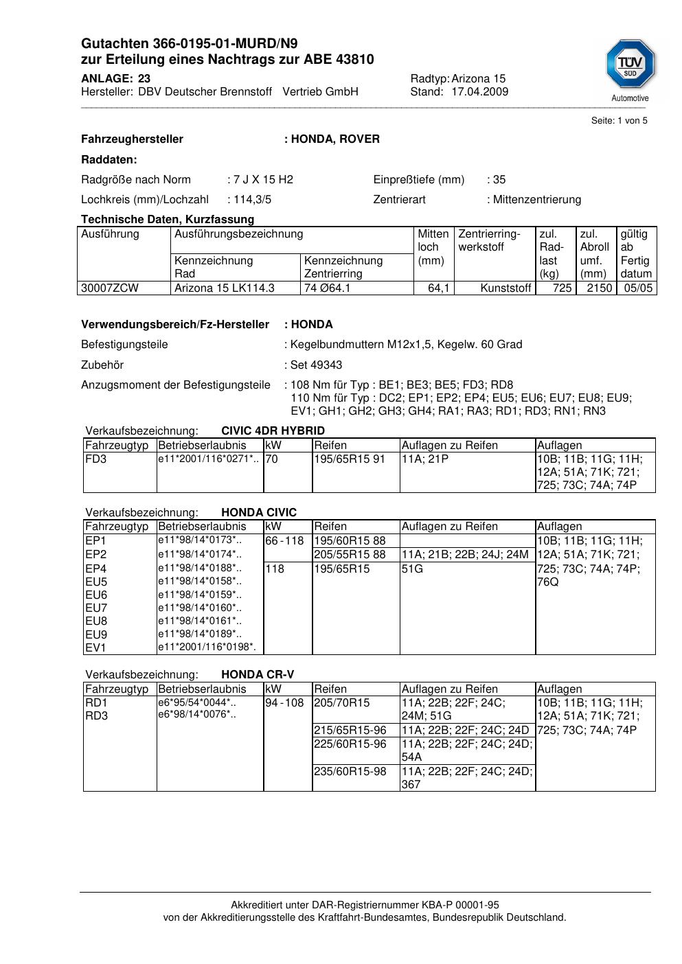 Dieses Gutachten (abe) bezieht sich auf die Alufelge DBV Arizona 15 in der Ausführung ET 0, Mittenloch 0 mm (KBA 43810). Im PDF findest du typischerweise zulässige Reifengrößen, Auflagen/Anbauhinweise und – je nach Dokument – Hinweise zur Eintragung.