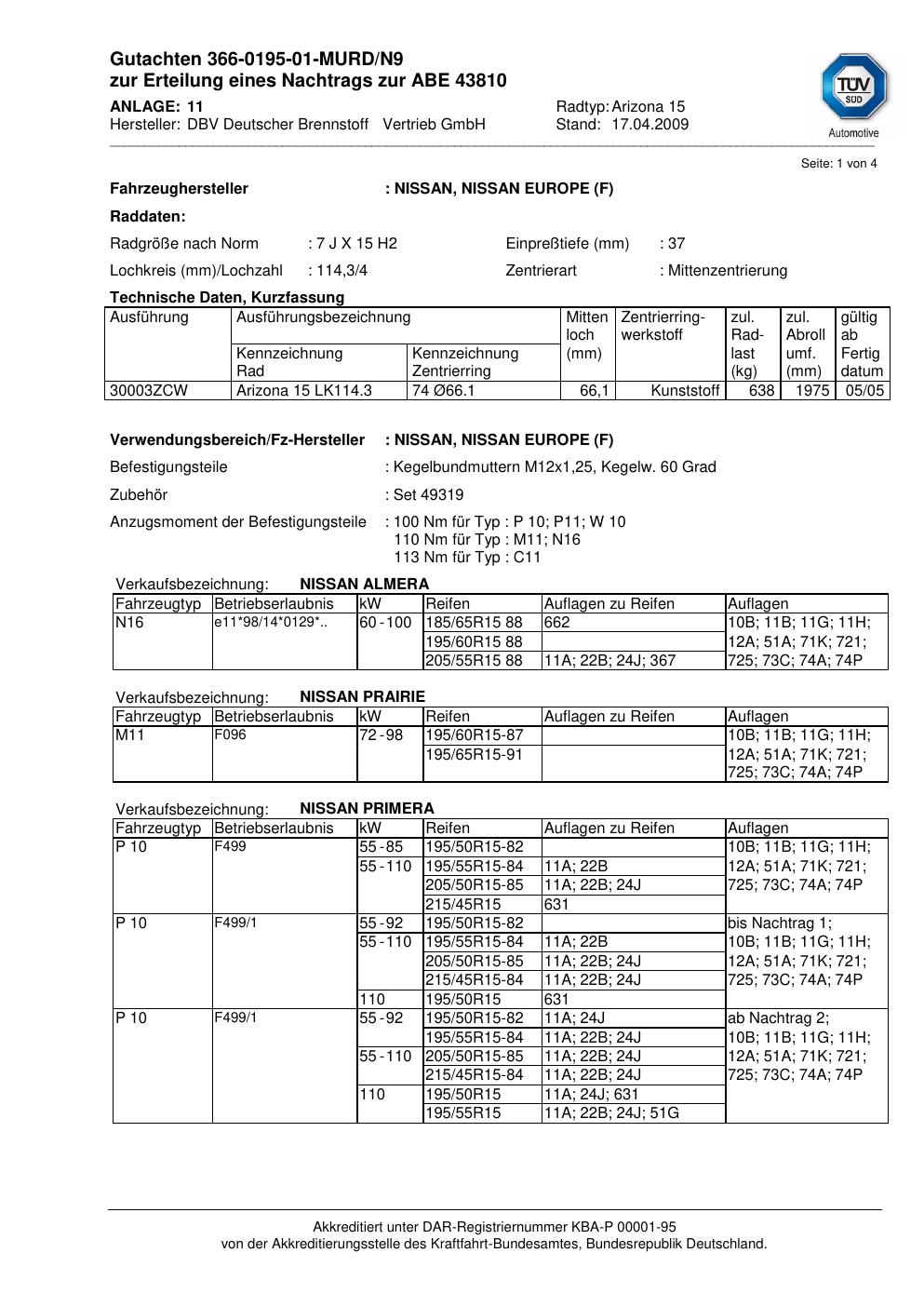 Felgengutachten / abe für Alufelgen DBV Deutscher Brennstoff Vertrieb GmbH Arizona 15 (ET 0, Mittenloch 0 mm) mit KBA 43810 (Zertifikatsnummer 43810). Hier kostenlos als PDF herunterladen. Der Download-Link ist 24 Stunden gültig und kann bis zu zwei Mal verwendet werden.
