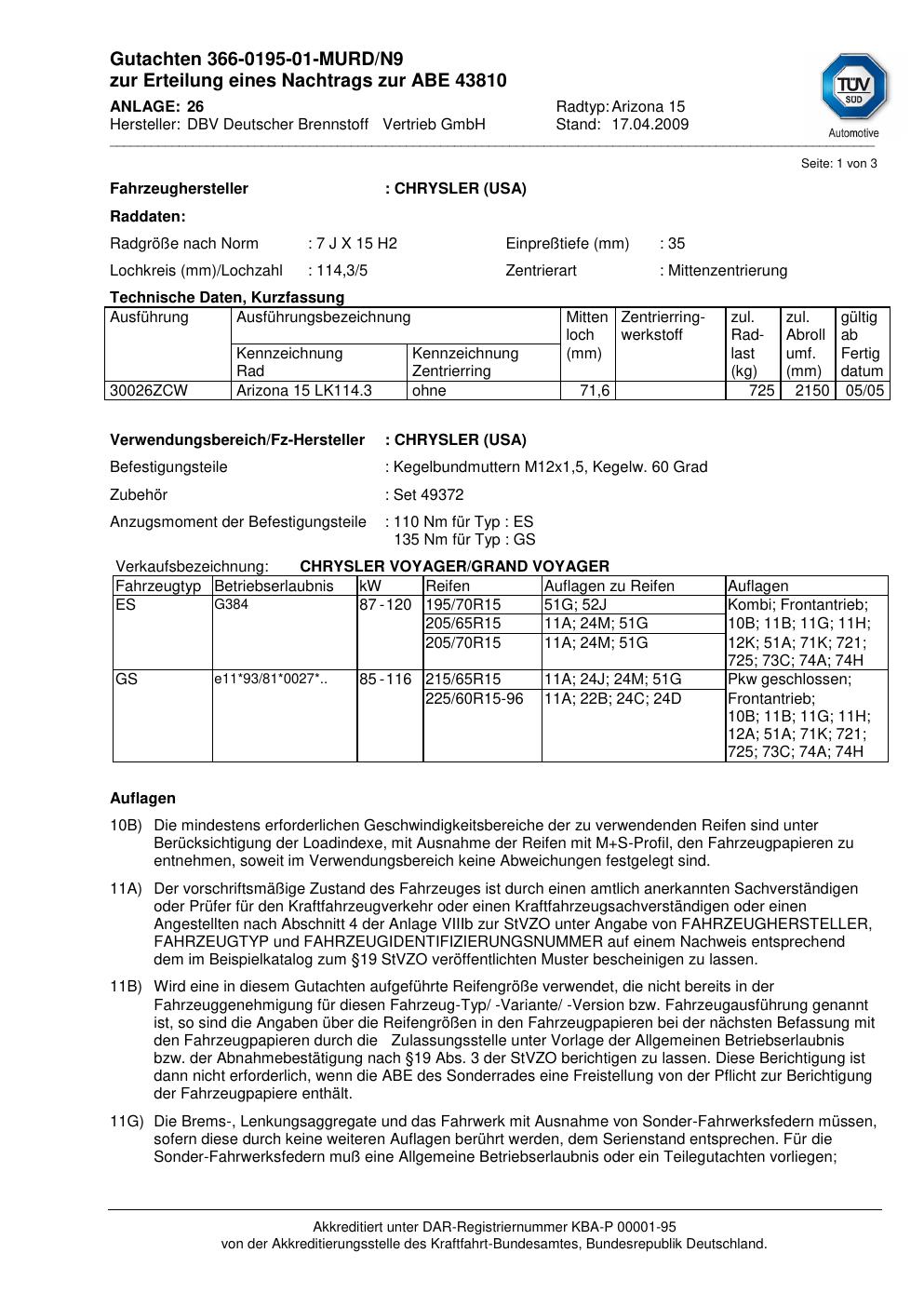 Felgengutachten / abe für Alufelgen DBV Deutscher Brennstoff Vertrieb GmbH Arizona 15 (ET 0, Mittenloch 0 mm) mit KBA 43810 (Zertifikatsnummer 43810). Hier kostenlos als PDF herunterladen. Der Download-Link ist 24 Stunden gültig und kann bis zu zwei Mal verwendet werden.