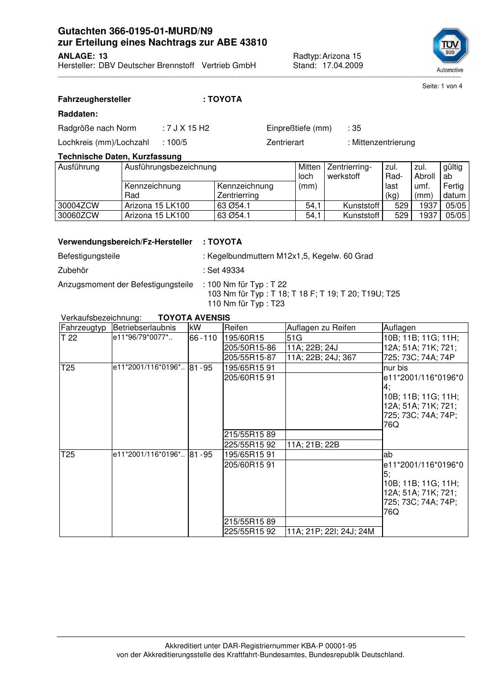 Felgengutachten / abe für Alufelgen DBV Deutscher Brennstoff Vertrieb GmbH Arizona 15 (ET 0, Mittenloch 0 mm) mit KBA 43810 (Zertifikatsnummer 43810). Hier kostenlos als PDF herunterladen. Der Download-Link ist 24 Stunden gültig und kann bis zu zwei Mal verwendet werden.