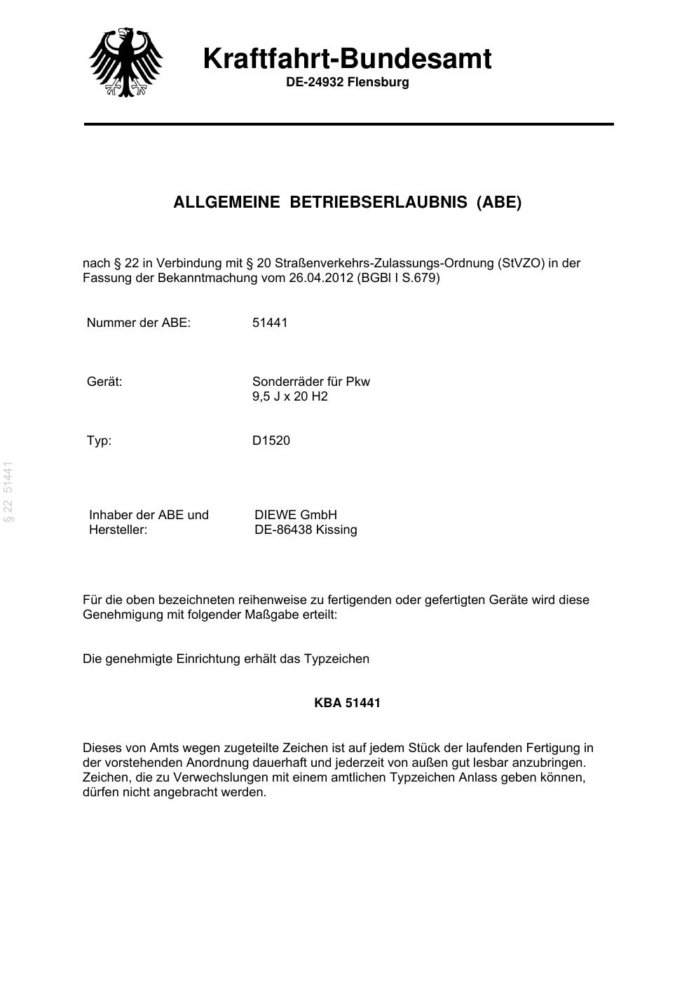 Dieses Gutachten (ABE) bezieht sich auf die Alufelge Diewe Turbina in der Ausführung 9.5Jx2 ET 0, Mittenloch 0 mm (KBA 51441). Im PDF findest du typischerweise zulässige Reifengrößen, Auflagen/Anbauhinweise und – je nach Dokument – Hinweise zur Eintragung.
