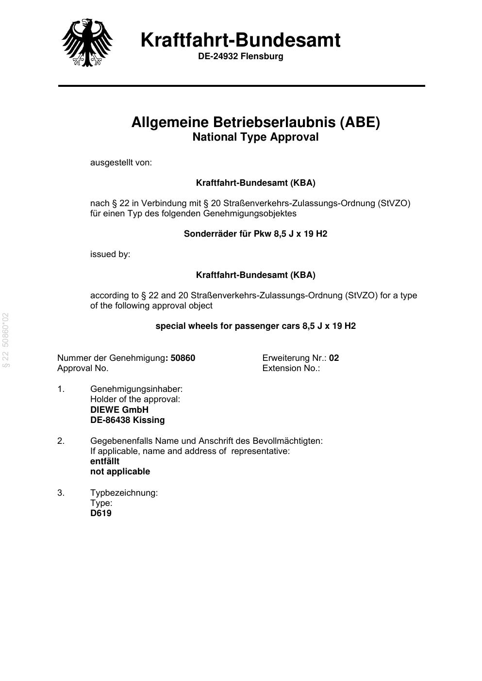 Felgengutachten / ABE für Alufelgen Diewe Vittoria (8.5Jx19 ET 0, Mittenloch 0 mm) mit KBA 50860 (Zertifikatsnummer 366-0038-16-MURD/N2). Hier kostenlos als PDF herunterladen. Der Download-Link ist 24 Stunden gültig und kann bis zu zwei Mal verwendet werden.