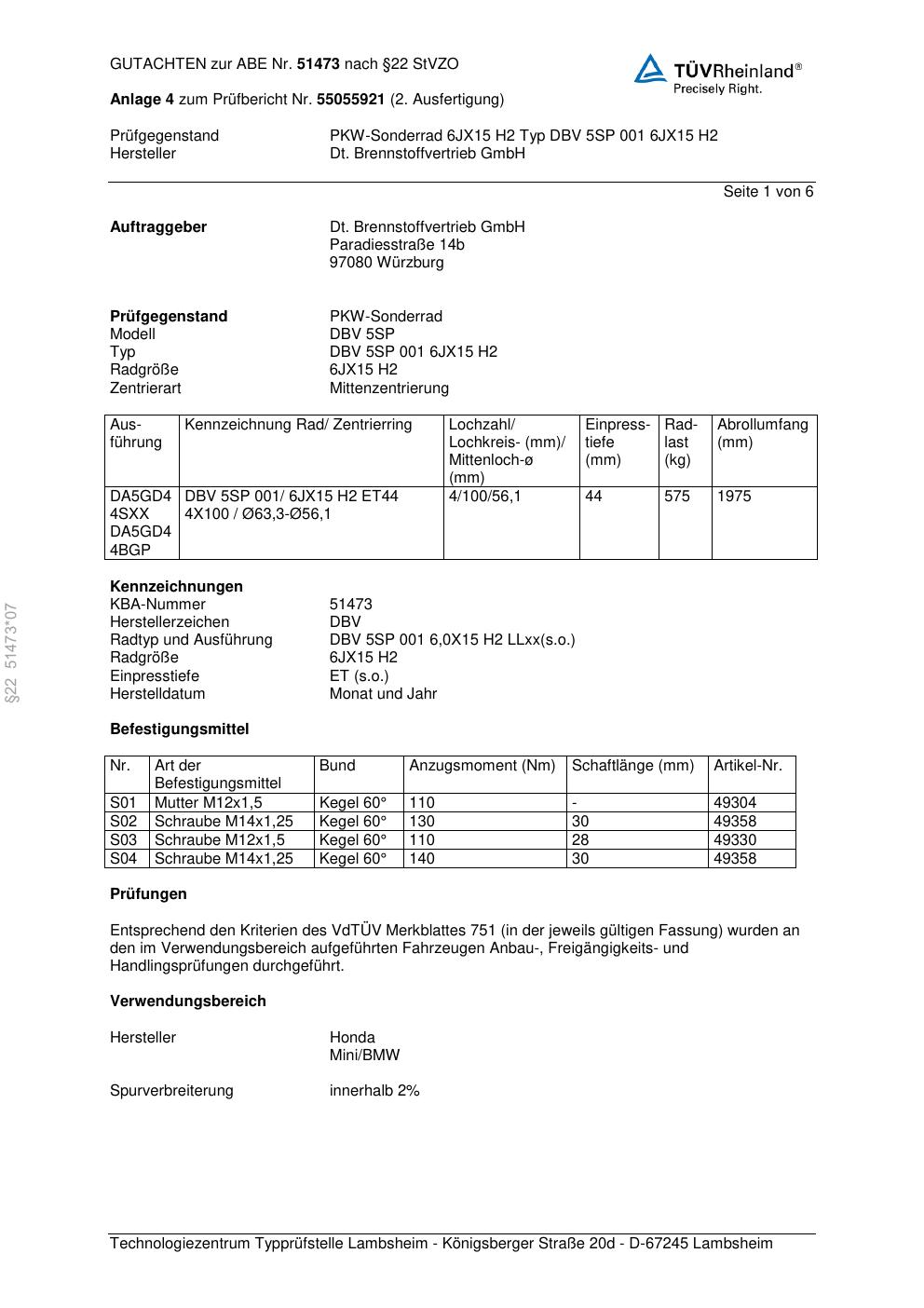 Dieses Gutachten (abe) bezieht sich auf die Alufelge DBV DBV 5SP in der Ausführung ET 0, Mittenloch 0 mm (KBA 51473). Im PDF findest du typischerweise zulässige Reifengrößen, Auflagen/Anbauhinweise und – je nach Dokument – Hinweise zur Eintragung.