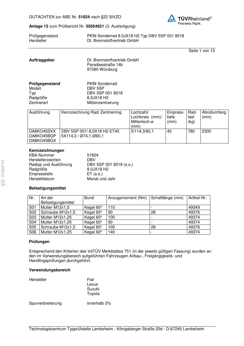 Dieses Gutachten (abe) bezieht sich auf die Alufelge DBV DBV 5SP in der Ausführung ET 0, Mittenloch 0 mm (KBA 51824). Im PDF findest du typischerweise zulässige Reifengrößen, Auflagen/Anbauhinweise und – je nach Dokument – Hinweise zur Eintragung.