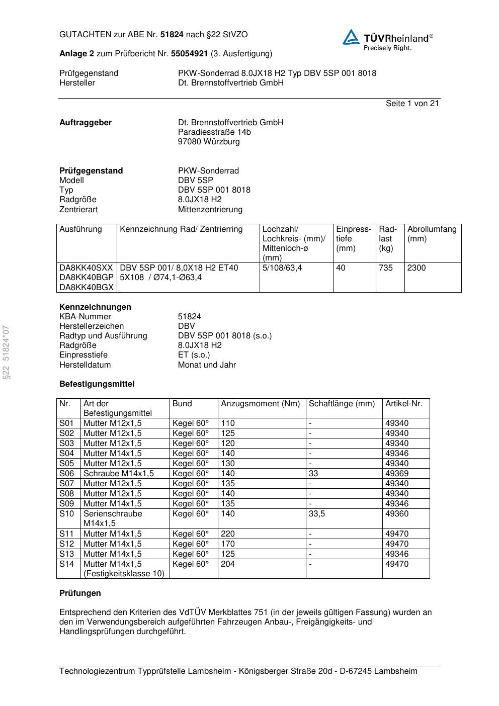 Dieses Gutachten (abe) bezieht sich auf die Alufelge Dt. Brennstoffvertrieb GmbH DBV 5SP in der Ausführung ET 0, Mittenloch 0 mm (KBA 51824). Im PDF findest du typischerweise zulässige Reifengrößen, Auflagen/Anbauhinweise und – je nach Dokument – Hinweise zur Eintragung.