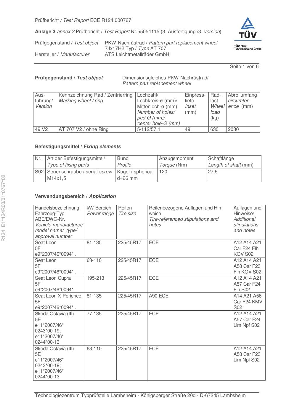 Felgengutachten / ece für Alufelgen ATS AT 707 (7Jx17 ET 0, Mittenloch 0 mm) (Zertifikatsnummer e1-124r00-01-0767-02). Hier kostenlos als PDF herunterladen. Der Download-Link ist 24 Stunden gültig und kann bis zu zwei Mal verwendet werden.