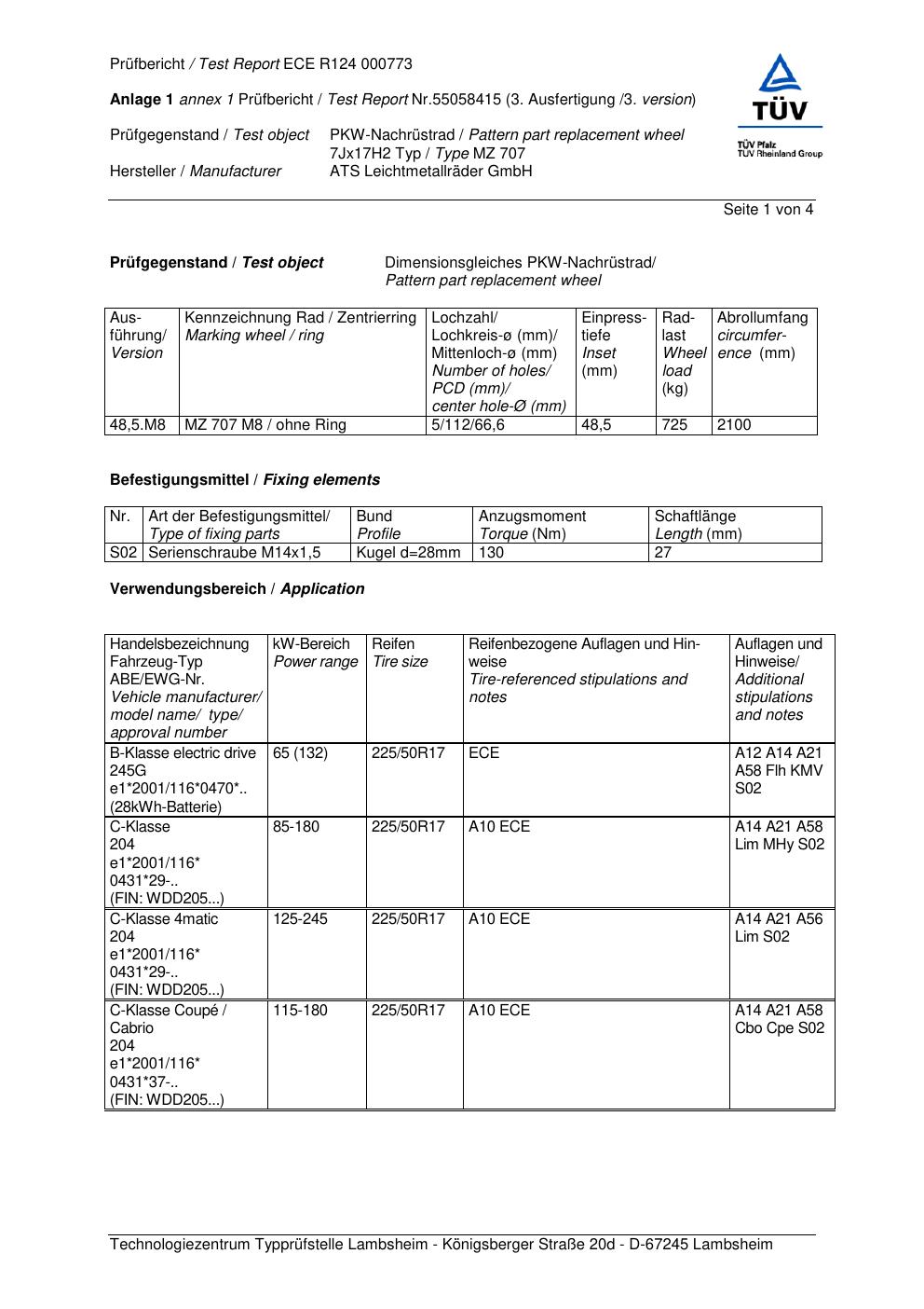 Dieses Gutachten (ece) bezieht sich auf die Alufelge ATS MZ 707 in der Ausführung 7Jx17 ET 0, Mittenloch 0 mm . Im PDF findest du typischerweise zulässige Reifengrößen, Auflagen/Anbauhinweise und – je nach Dokument – Hinweise zur Eintragung.