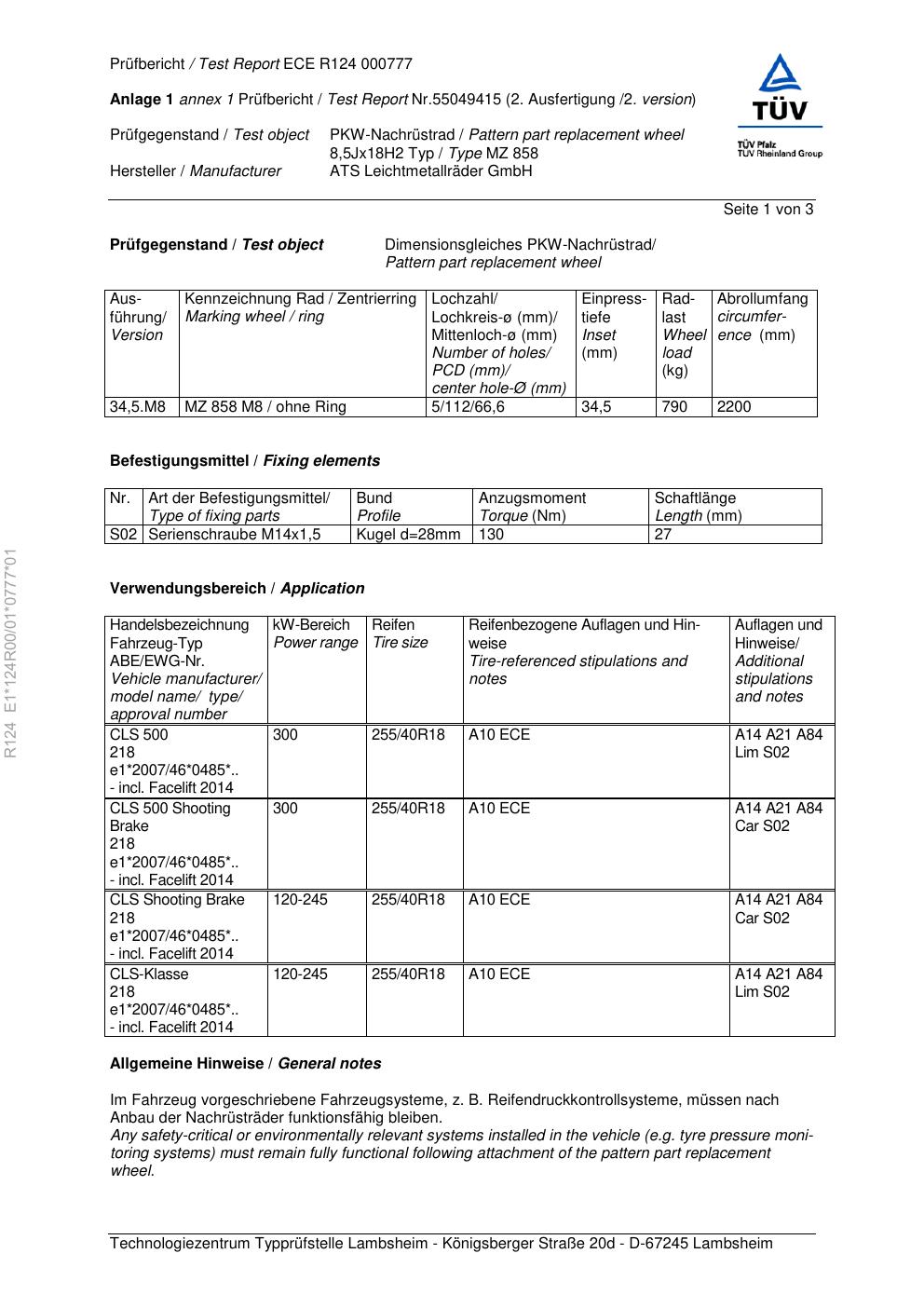 Felgengutachten / ece für Alufelgen ATS MZ 858 (8.5Jx18 ET 0, Mittenloch 0 mm) (Zertifikatsnummer e1-124r00-01-0777-01). Hier kostenlos als PDF herunterladen. Der Download-Link ist 24 Stunden gültig und kann bis zu zwei Mal verwendet werden.