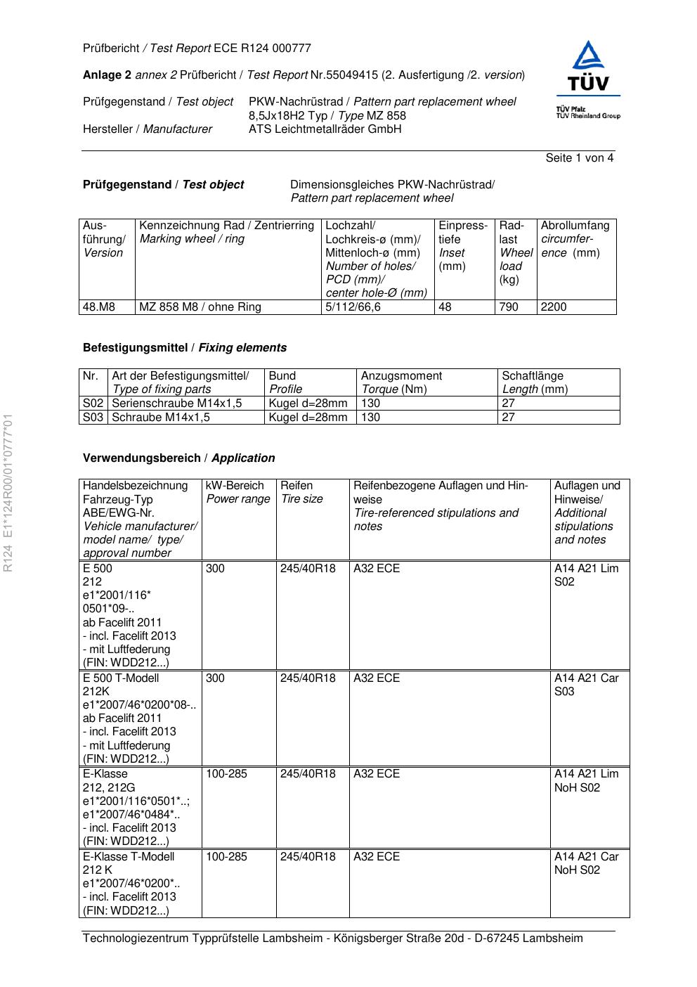 Felgengutachten / ece für Alufelgen ATS MZ 858 (8.5Jx18 ET 0, Mittenloch 0 mm) (Zertifikatsnummer e1-124r00-01-0777-01). Hier kostenlos als PDF herunterladen. Der Download-Link ist 24 Stunden gültig und kann bis zu zwei Mal verwendet werden.