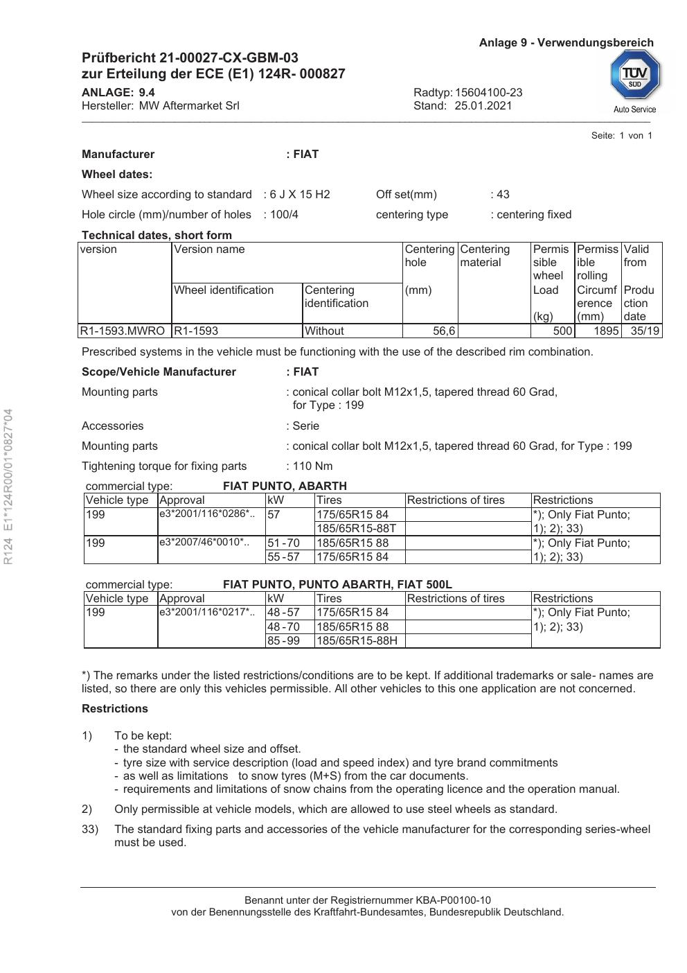Dieses Gutachten (ece) bezieht sich auf die Alufelge Rial 15604100-23 in der Ausführung 6Jx15 ET 0, Mittenloch 0 mm . Im PDF findest du typischerweise zulässige Reifengrößen, Auflagen/Anbauhinweise und – je nach Dokument – Hinweise zur Eintragung.
