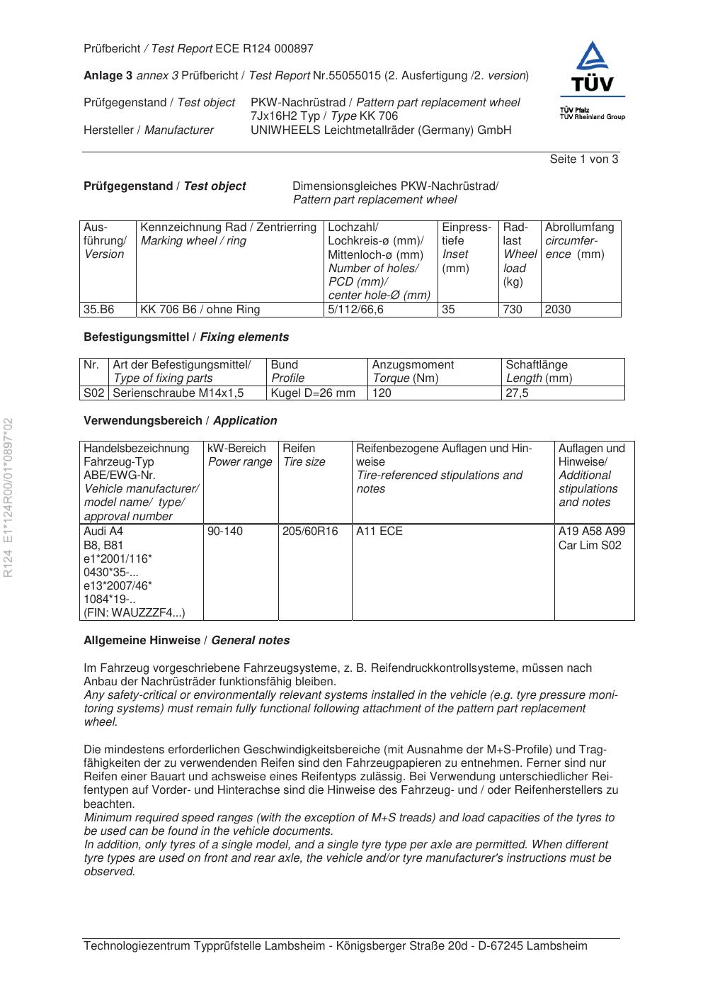 Felgengutachten / ece für Alufelgen Rial KK 706 (7Jx16 ET 0, Mittenloch 0 mm) (Zertifikatsnummer e1-124r00-01-0897-02). Hier kostenlos als PDF herunterladen. Der Download-Link ist 24 Stunden gültig und kann bis zu zwei Mal verwendet werden.