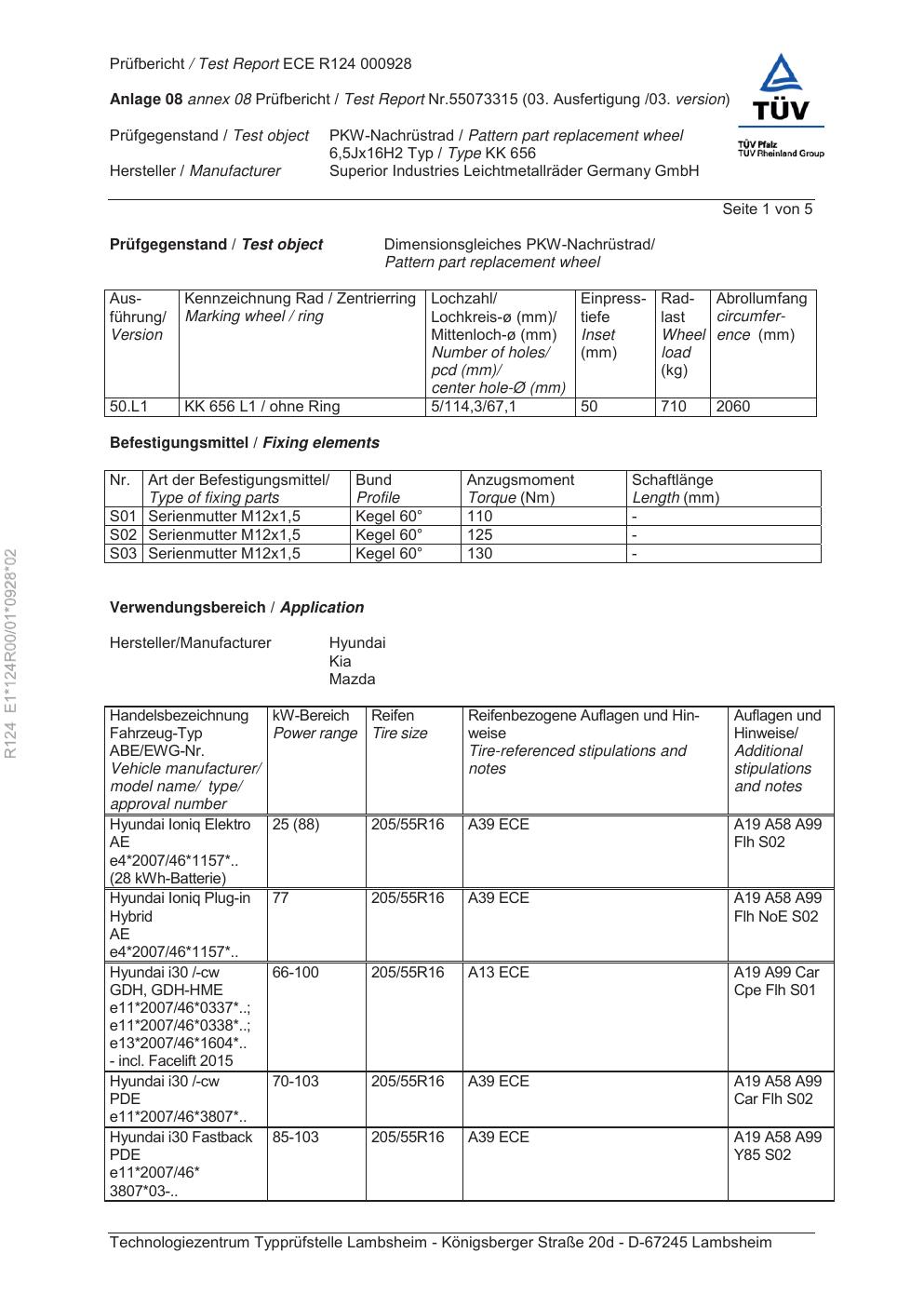 Felgengutachten / ece für Alufelgen Rial KK 656 (6.5Jx16 ET 0, Mittenloch 0 mm) (Zertifikatsnummer e1-124r00-01-0928-02). Hier kostenlos als PDF herunterladen. Der Download-Link ist 24 Stunden gültig und kann bis zu zwei Mal verwendet werden.
