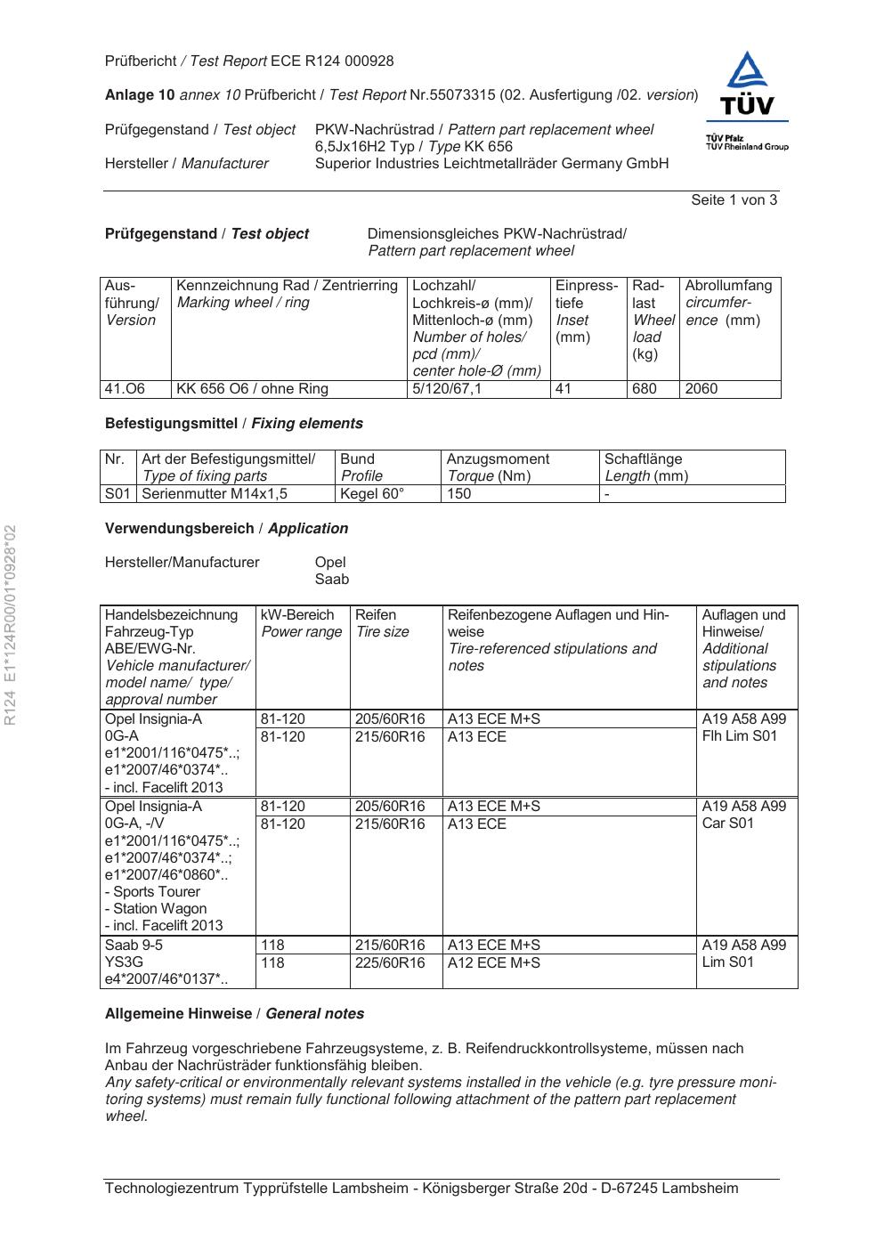 Dieses Gutachten (ece) bezieht sich auf die Alufelge Rial KK 656 in der Ausführung 6.5Jx16 ET 0, Mittenloch 0 mm . Im PDF findest du typischerweise zulässige Reifengrößen, Auflagen/Anbauhinweise und – je nach Dokument – Hinweise zur Eintragung.