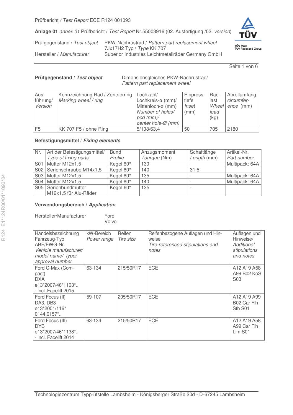 Felgengutachten / ece für Alufelgen Rial KK 707 (7Jx17 ET 0, Mittenloch 0 mm) (Zertifikatsnummer e1-124r00-01-1093-04). Hier kostenlos als PDF herunterladen. Der Download-Link ist 24 Stunden gültig und kann bis zu zwei Mal verwendet werden.