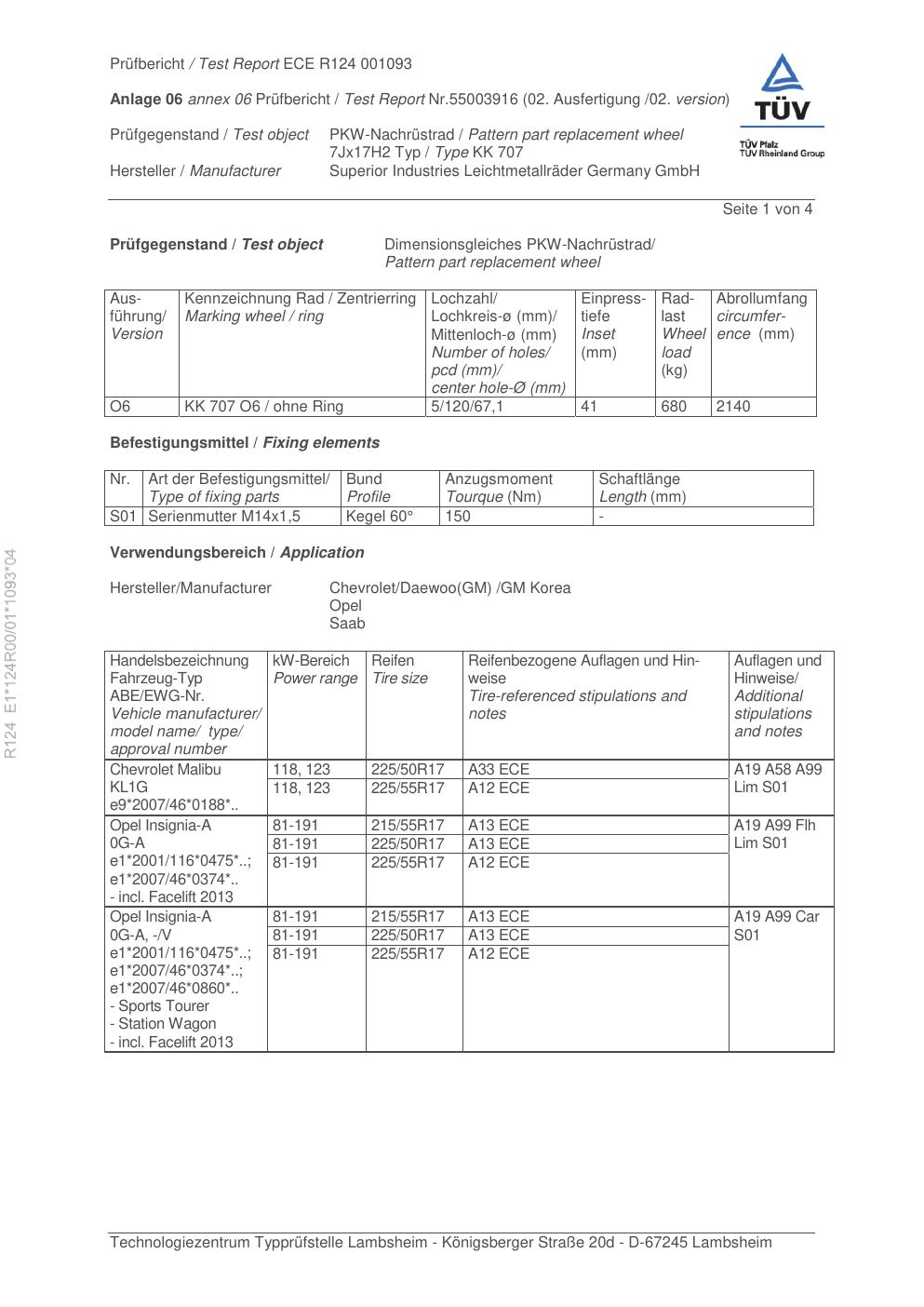 Felgengutachten / ece für Alufelgen Rial KK 707 (7Jx17 ET 0, Mittenloch 0 mm) (Zertifikatsnummer e1-124r00-01-1093-04). Hier kostenlos als PDF herunterladen. Der Download-Link ist 24 Stunden gültig und kann bis zu zwei Mal verwendet werden.