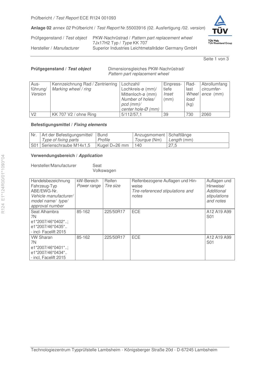 Felgengutachten / ece für Alufelgen Rial KK 707 (7Jx17 ET 0, Mittenloch 0 mm) (Zertifikatsnummer e1-124r00-01-1093-04). Hier kostenlos als PDF herunterladen. Der Download-Link ist 24 Stunden gültig und kann bis zu zwei Mal verwendet werden.