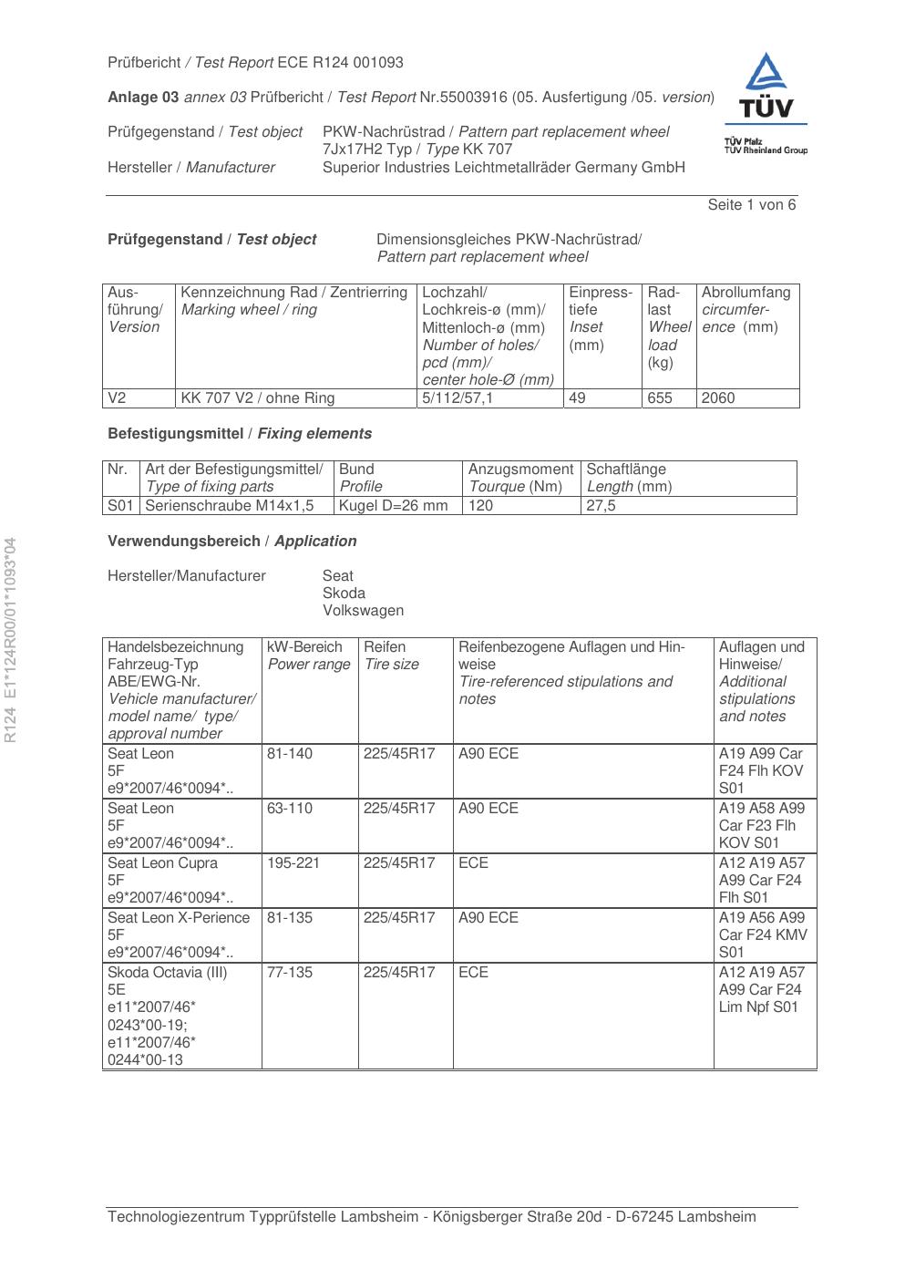 Felgengutachten / ece für Alufelgen Rial KK 707 (7Jx17 ET 0, Mittenloch 0 mm) (Zertifikatsnummer e1-124r00-01-1093-04). Hier kostenlos als PDF herunterladen. Der Download-Link ist 24 Stunden gültig und kann bis zu zwei Mal verwendet werden.