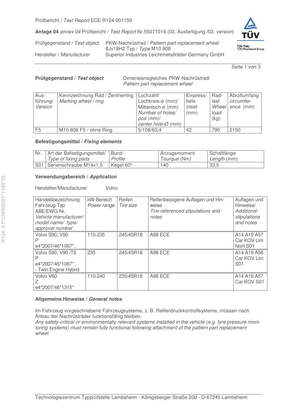 Felgengutachten / ece für Alufelgen Rial M10 808 (8Jx18 ET 0, Mittenloch 0 mm) (Zertifikatsnummer e1-124r00-01-1159-03). Hier kostenlos als PDF herunterladen. Der Download-Link ist 24 Stunden gültig und kann bis zu zwei Mal verwendet werden.