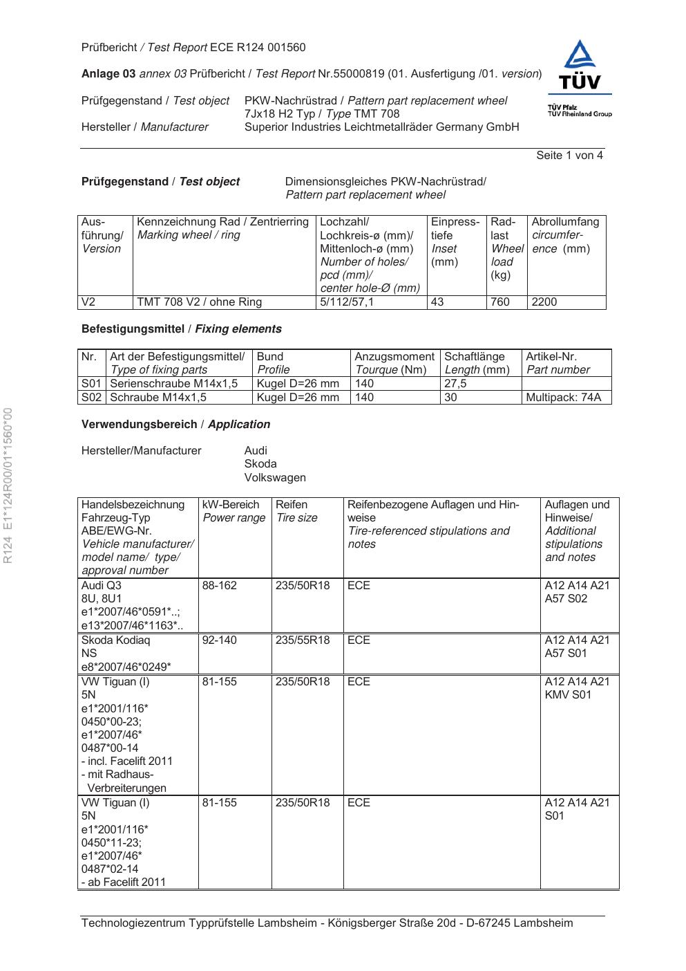 Felgengutachten / ece für Alufelgen RIAL TMT 708 (7Jx18 ET 0, Mittenloch 0 mm) (Zertifikatsnummer e1-124r00-01-1560-00). Hier kostenlos als PDF herunterladen. Der Download-Link ist 24 Stunden gültig und kann bis zu zwei Mal verwendet werden.