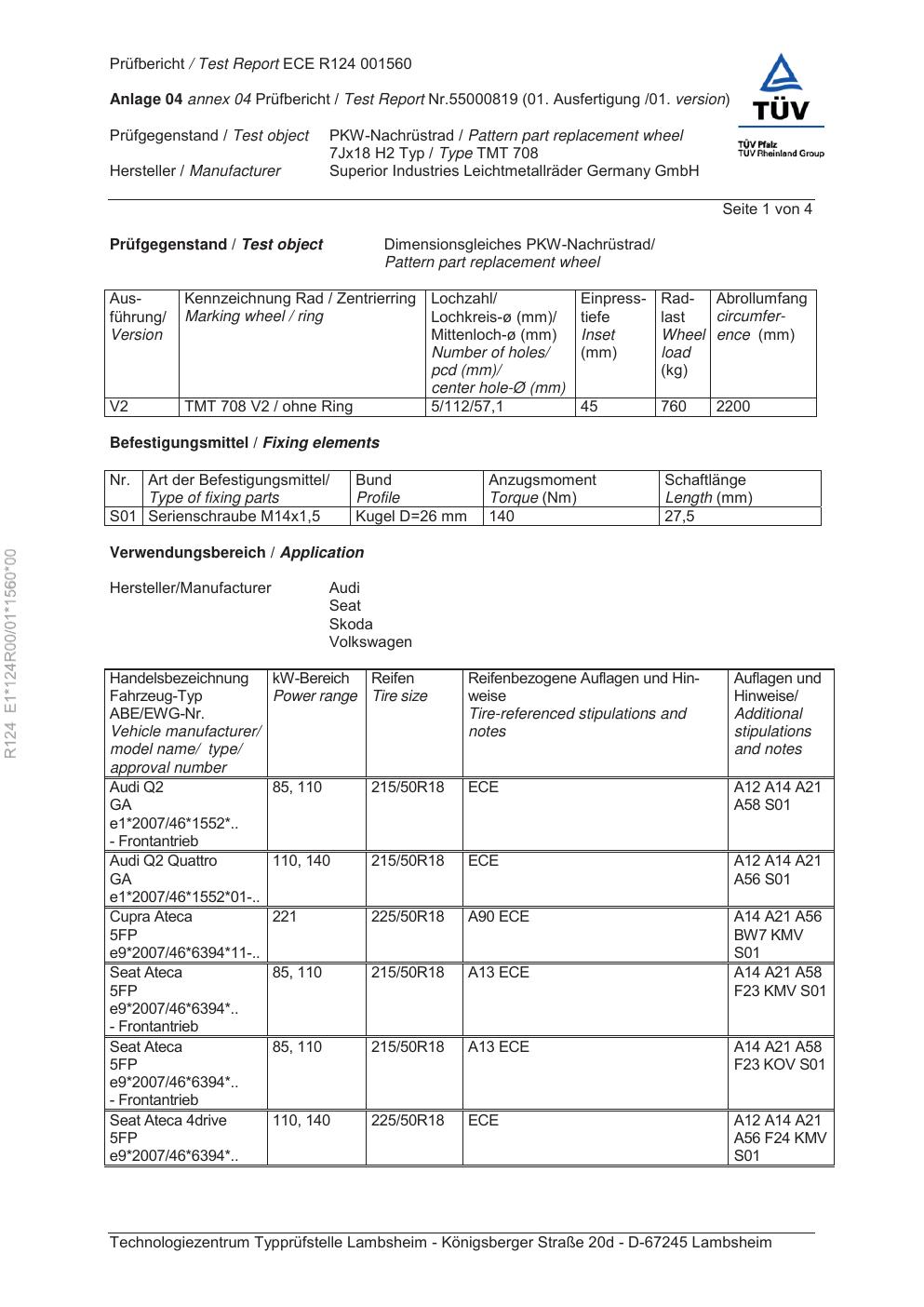 Felgengutachten / ece für Alufelgen RIAL TMT 708 (7Jx18 ET 0, Mittenloch 0 mm) (Zertifikatsnummer e1-124r00-01-1560-00). Hier kostenlos als PDF herunterladen. Der Download-Link ist 24 Stunden gültig und kann bis zu zwei Mal verwendet werden.