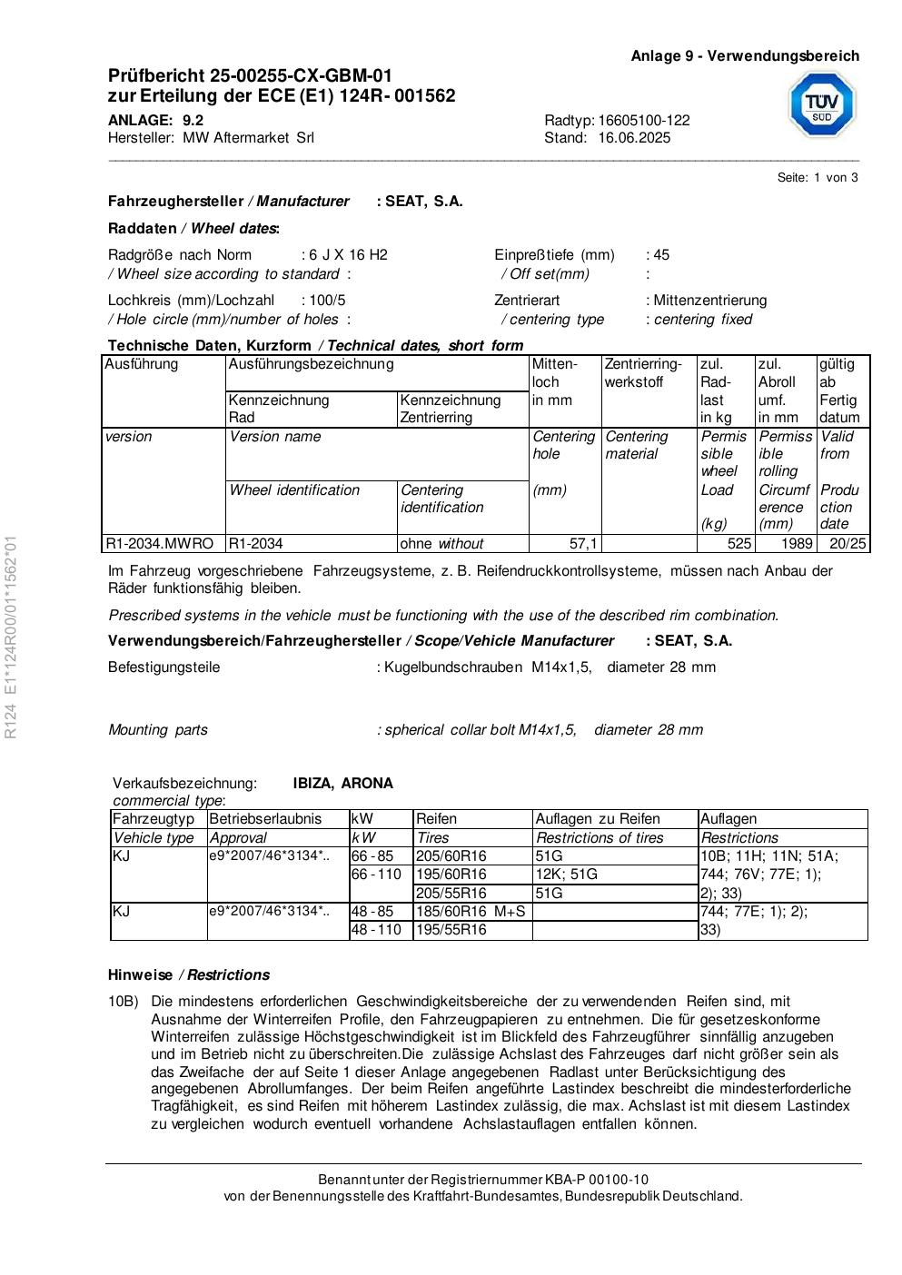 Dieses Gutachten (ece) bezieht sich auf die Alufelge RIAL 16605100 -122 in der Ausführung 6Jx16 ET 0, Mittenloch 0 mm . Im PDF findest du typischerweise zulässige Reifengrößen, Auflagen/Anbauhinweise und – je nach Dokument – Hinweise zur Eintragung.