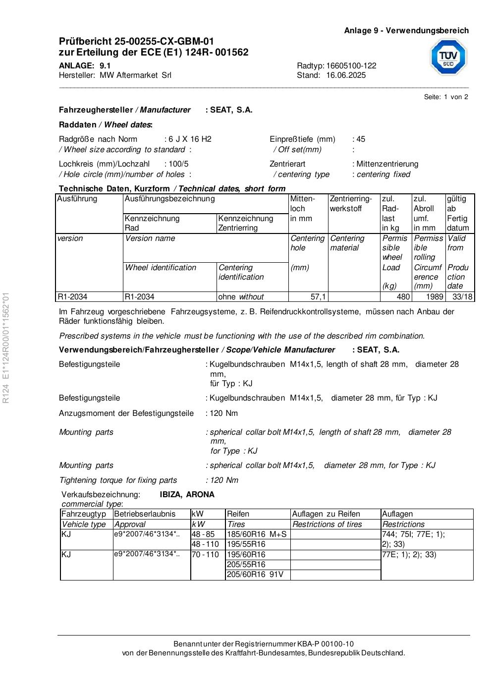 Dieses Gutachten (ece) bezieht sich auf die Alufelge RIAL 16605100 -122 in der Ausführung 6Jx16 ET 0, Mittenloch 0 mm . Im PDF findest du typischerweise zulässige Reifengrößen, Auflagen/Anbauhinweise und – je nach Dokument – Hinweise zur Eintragung.