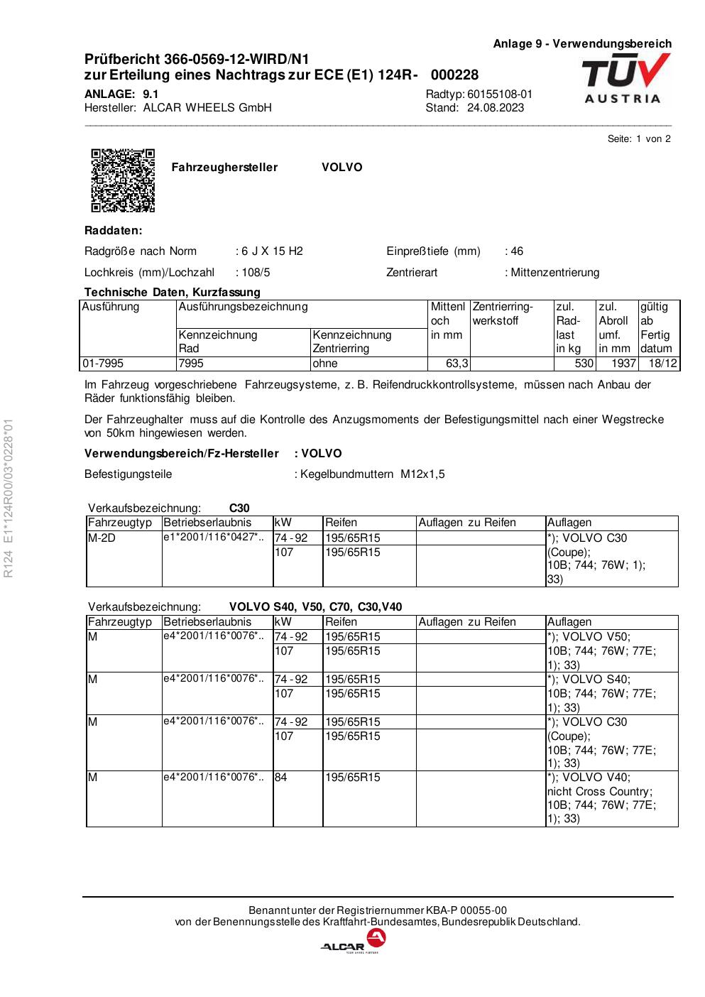 Dieses Gutachten (ece) bezieht sich auf die Alufelge alcar 60155108 -01 in der Ausführung 6Jx15 ET 0, Mittenloch 0 mm . Im PDF findest du typischerweise zulässige Reifengrößen, Auflagen/Anbauhinweise und – je nach Dokument – Hinweise zur Eintragung.