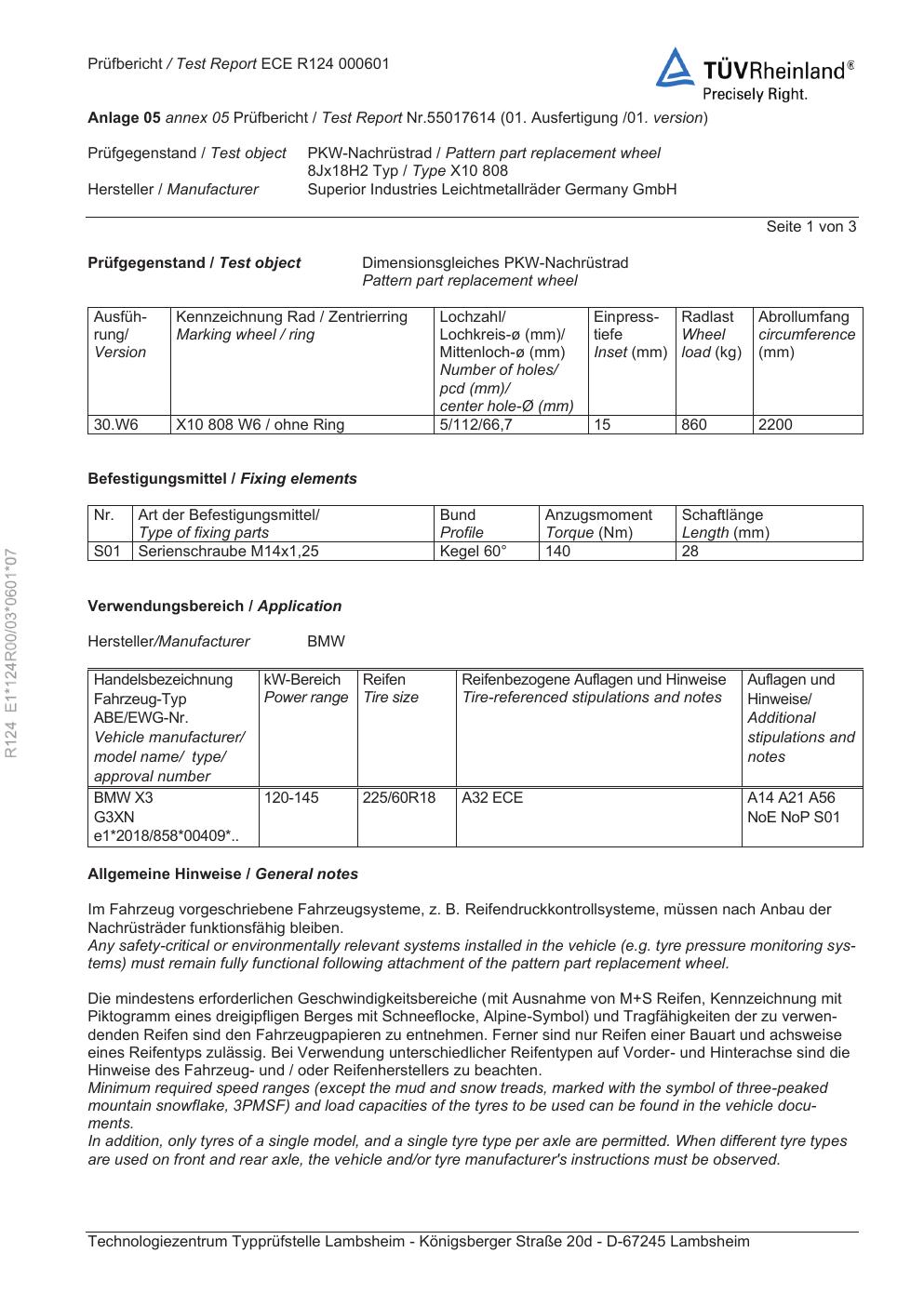 Dieses Gutachten (ece) bezieht sich auf die Alufelge Superior X10 808 in der Ausführung 8Jx18 ET 0, Mittenloch 0 mm . Im PDF findest du typischerweise zulässige Reifengrößen, Auflagen/Anbauhinweise und – je nach Dokument – Hinweise zur Eintragung.