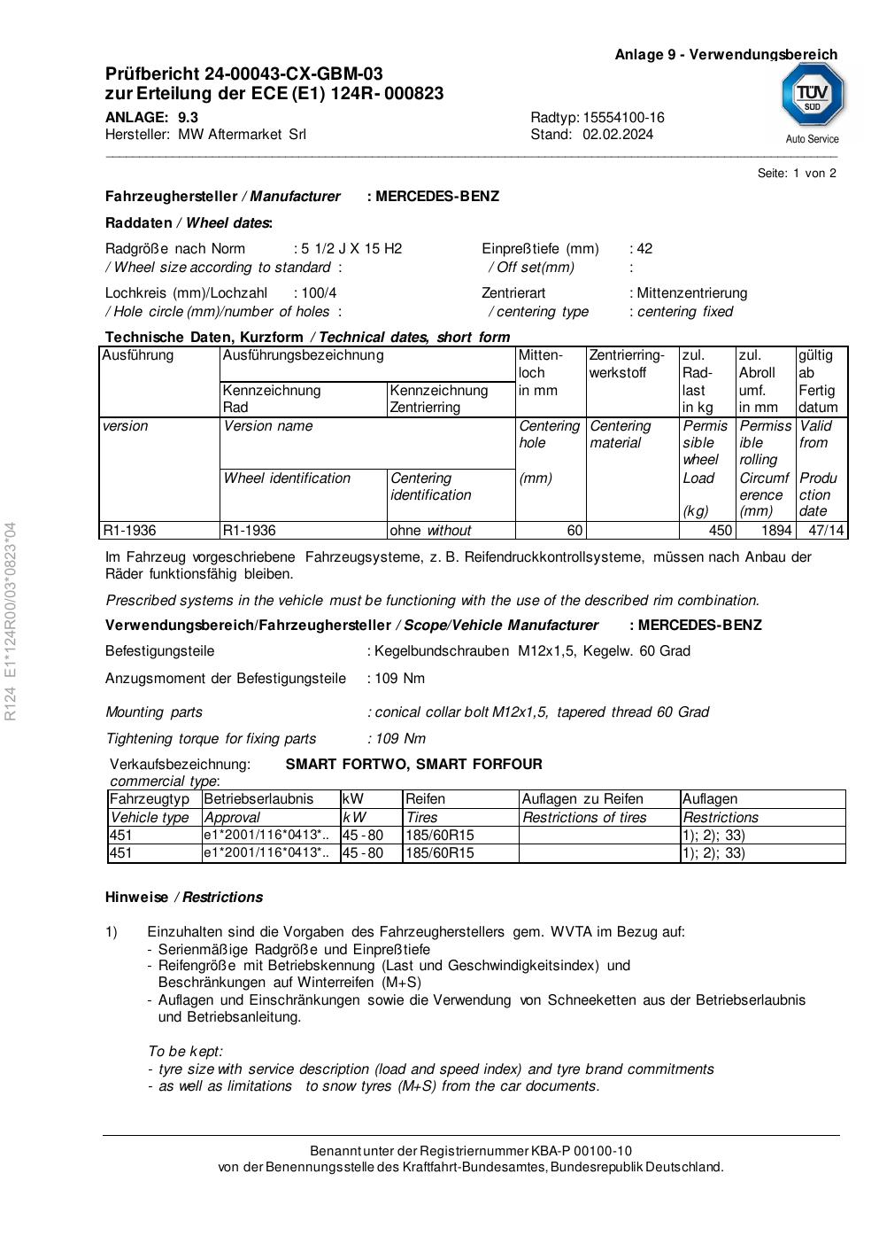 Felgengutachten / ece für Alufelgen Rial 15554100 -16 (2Jx15 ET 0, Mittenloch 0 mm) (Zertifikatsnummer e1-124r00-03-0823-04). Hier kostenlos als PDF herunterladen. Der Download-Link ist 24 Stunden gültig und kann bis zu zwei Mal verwendet werden.