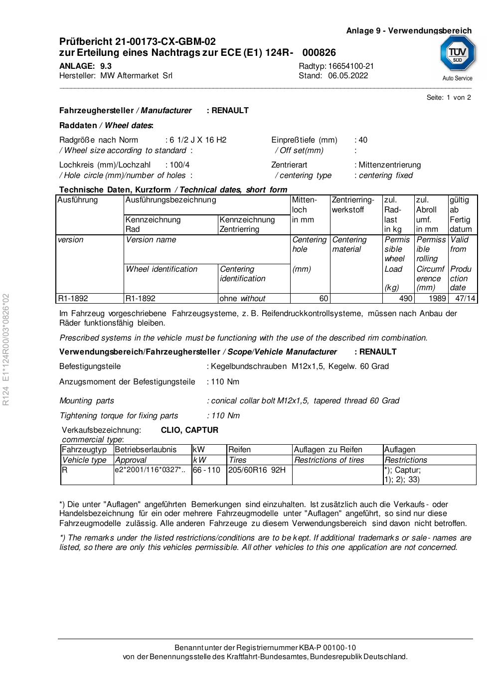 Felgengutachten / ece für Alufelgen Rial 16654100 -21 (2Jx16 ET 0, Mittenloch 0 mm) (Zertifikatsnummer e1-124r00-03-0826-02). Hier kostenlos als PDF herunterladen. Der Download-Link ist 24 Stunden gültig und kann bis zu zwei Mal verwendet werden.