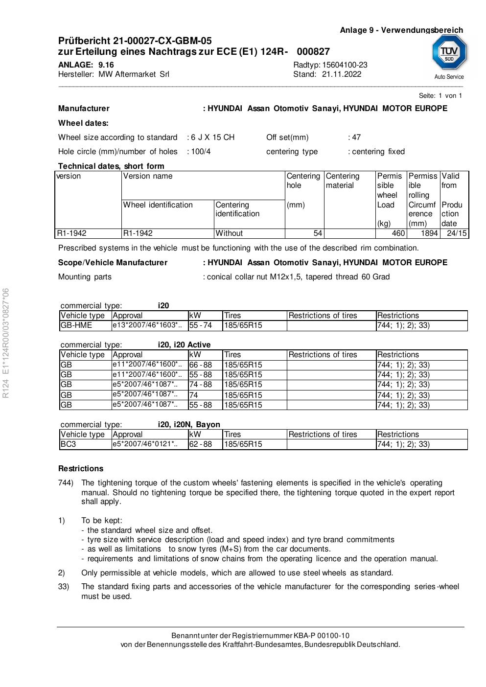 Felgengutachten / ece für Alufelgen Rial 15604100 -23 (6Jx15 ET 0, Mittenloch 0 mm) (Zertifikatsnummer e1-124r00-03-0827-06). Hier kostenlos als PDF herunterladen. Der Download-Link ist 24 Stunden gültig und kann bis zu zwei Mal verwendet werden.