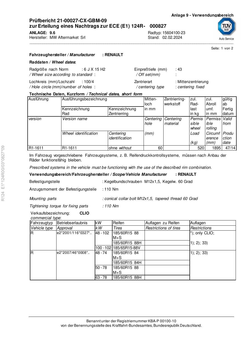 Felgengutachten / ece für Alufelgen Rial 15604100 -23 (6Jx15 ET 0, Mittenloch 0 mm) (Zertifikatsnummer e1-124r00-03-0827-09). Hier kostenlos als PDF herunterladen. Der Download-Link ist 24 Stunden gültig und kann bis zu zwei Mal verwendet werden.