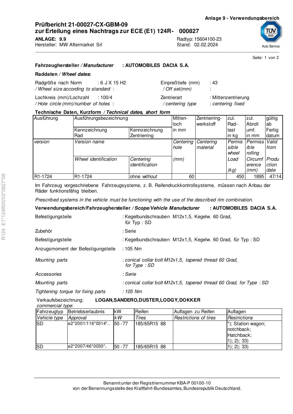 Felgengutachten / ece für Alufelgen Rial 15604100 -23 (6Jx15 ET 0, Mittenloch 0 mm) (Zertifikatsnummer e1-124r00-03-0827-09). Hier kostenlos als PDF herunterladen. Der Download-Link ist 24 Stunden gültig und kann bis zu zwei Mal verwendet werden.