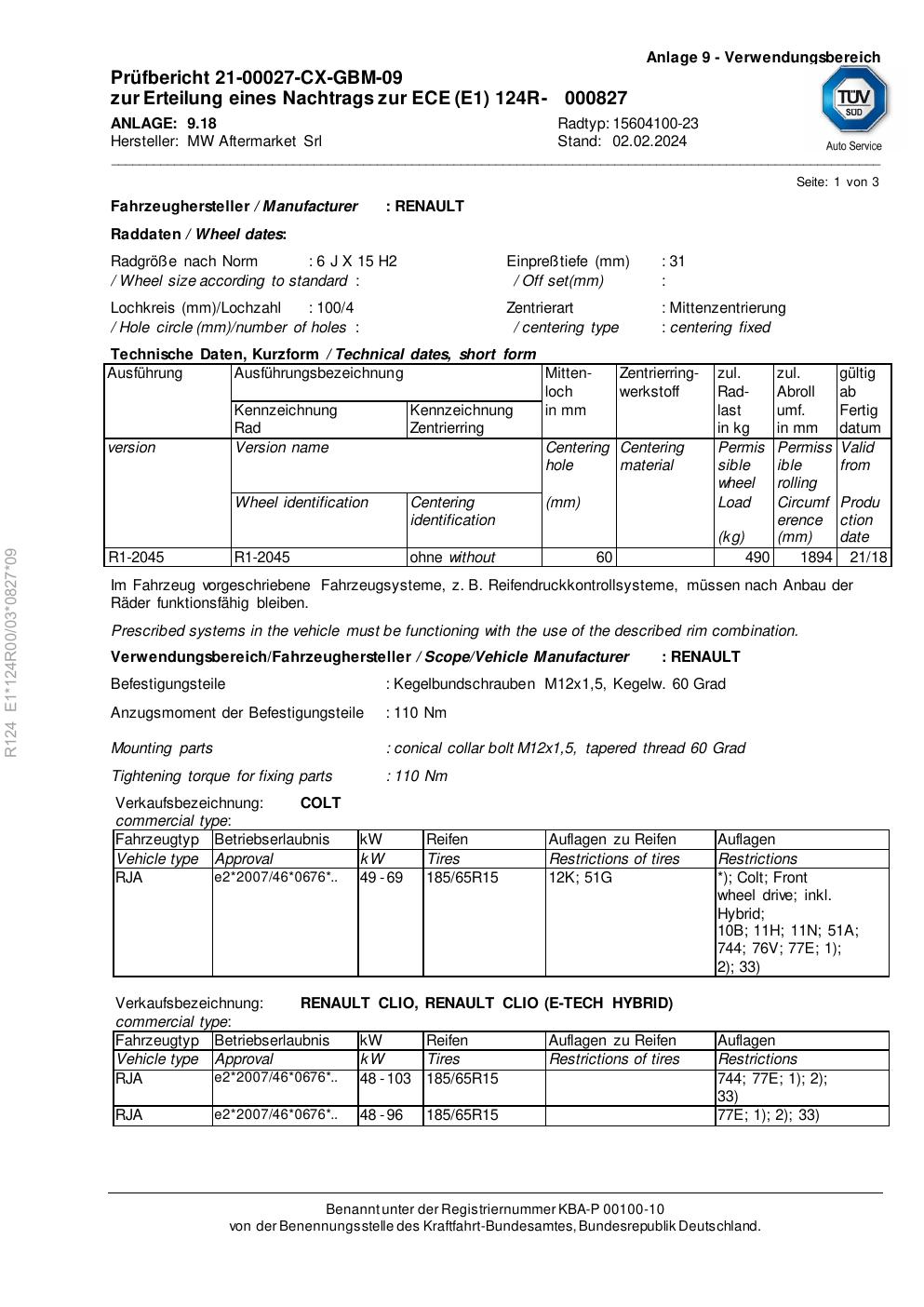 Felgengutachten / ece für Alufelgen Rial 15604100 -23 (6Jx15 ET 0, Mittenloch 0 mm) (Zertifikatsnummer e1-124r00-03-0827-09). Hier kostenlos als PDF herunterladen. Der Download-Link ist 24 Stunden gültig und kann bis zu zwei Mal verwendet werden.